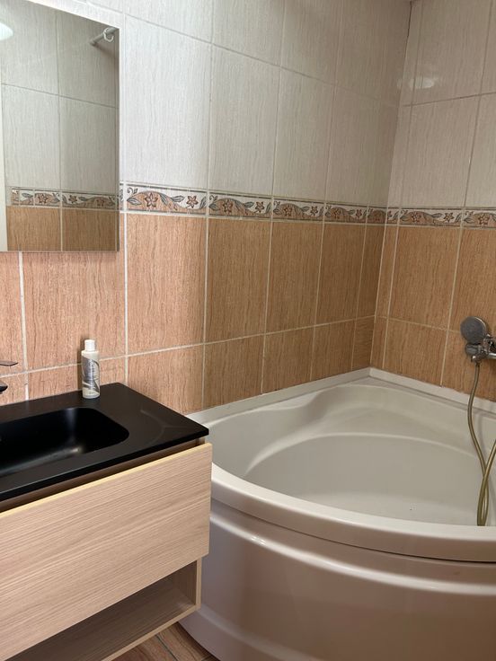 •Badkamer met hoekbad en lavabomeubel