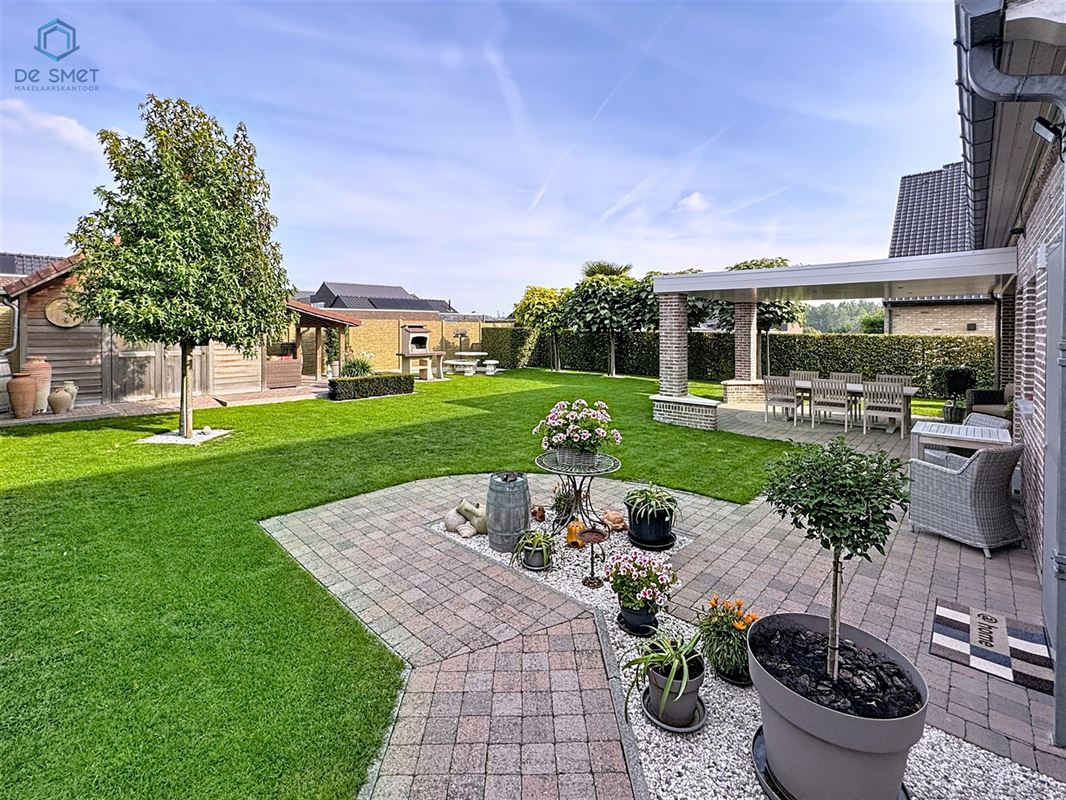 Geniet volop van de rust en privacy in de perfect onderhouden tuin met overdekt terras aan de woonkamer, cottage tuinhuis en charmante carport in landelijke stijl.