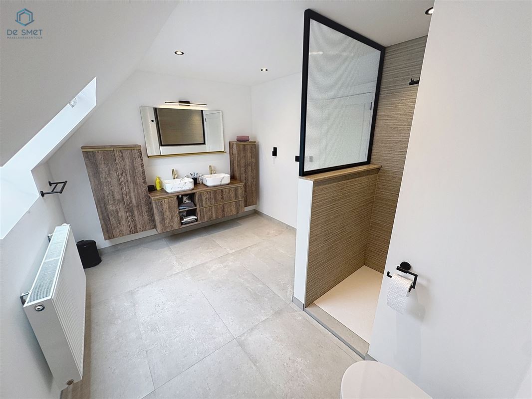 Op de eerste verdieping bevinden zich vier ruime slaapkamers, ideaal voor het hele gezin. De luxe badkamer is uitgerust met een dubbel lavabomeubel met gouden accenten, een inloopdouche met gouden douchekop en een apart toilet.