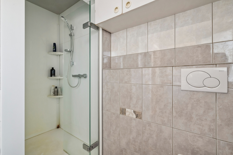Badkamer met douche lavabo en toilet.