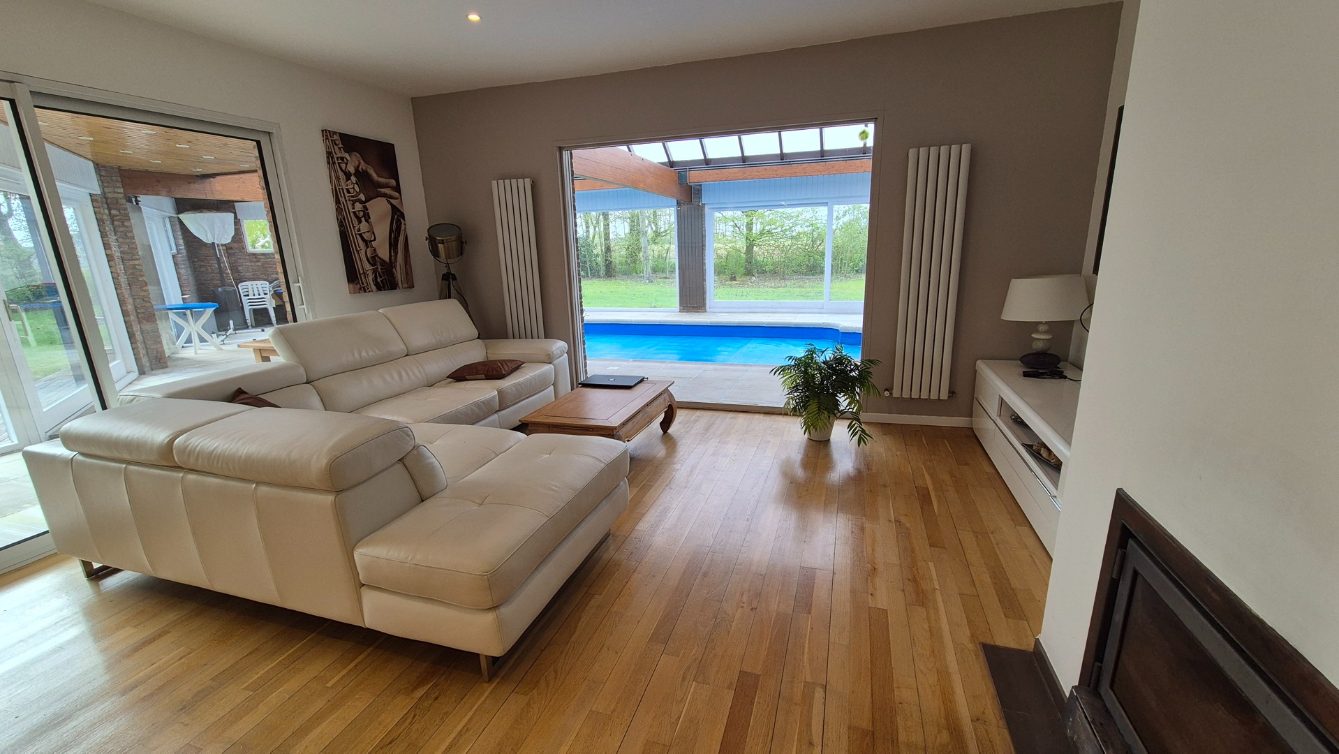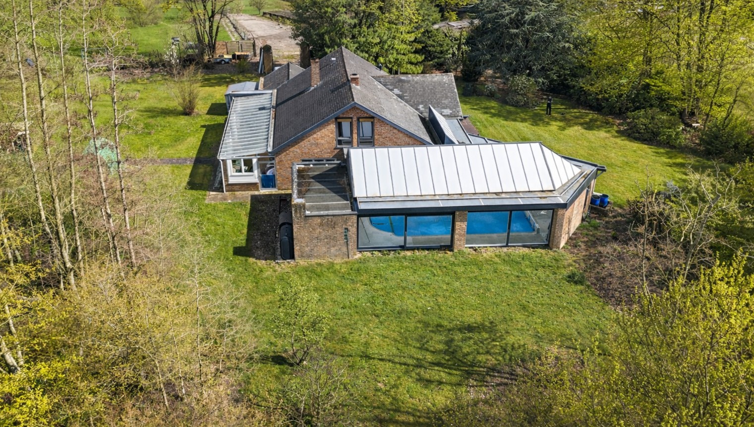 - Buiten geniet u van een uitzonderlijk aanbod aan extra’s: een veranda met zicht op het binnen zwembad (8×4 m), een poolhouse met douche en toilet, een atelier, een ruime garage en een kelder. Voor de woning is er bovendien parkeergelegenheid voor meerdere wagens.