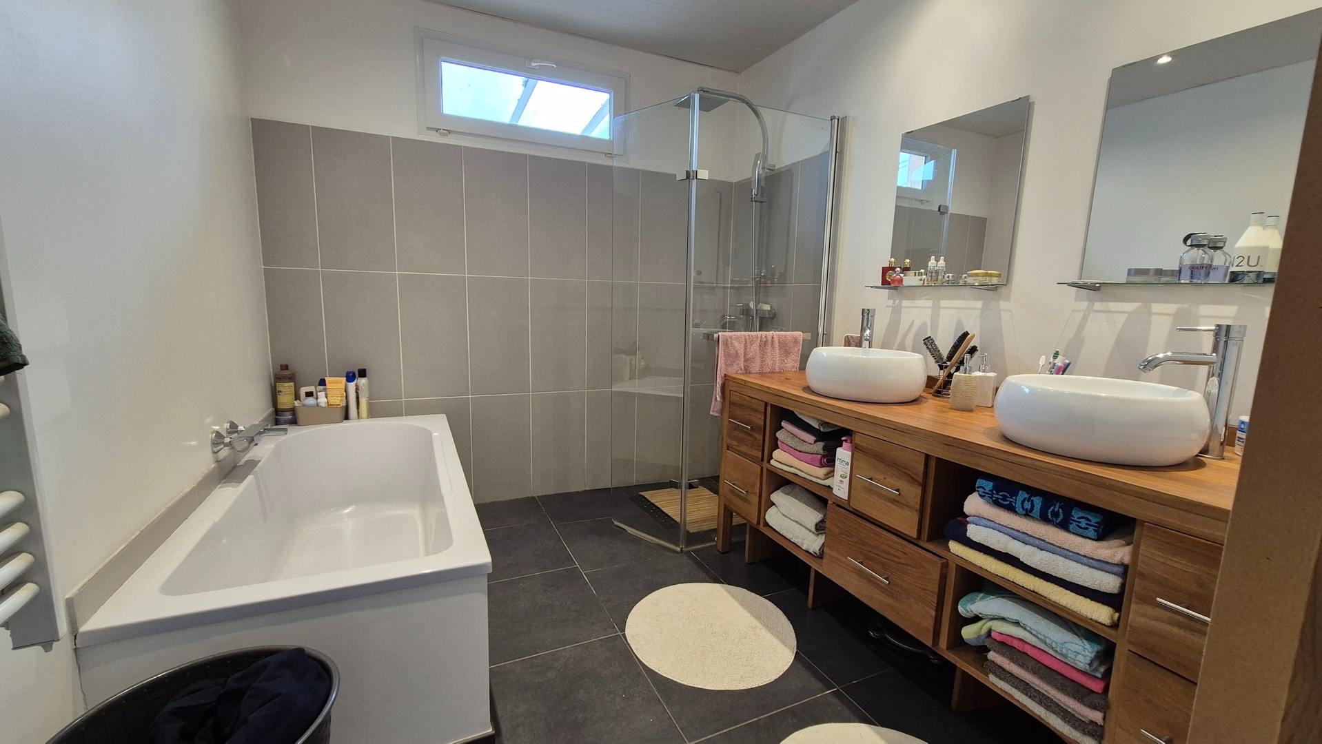- Volledig uitgeruste badkamer met dubbele lavabo, inloopdouche en ligbad