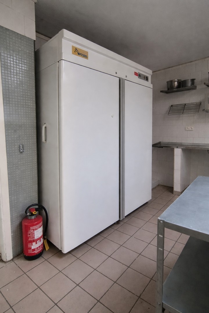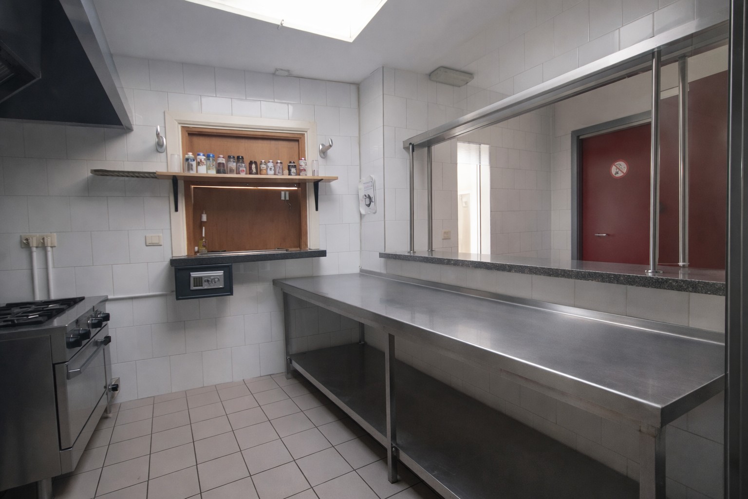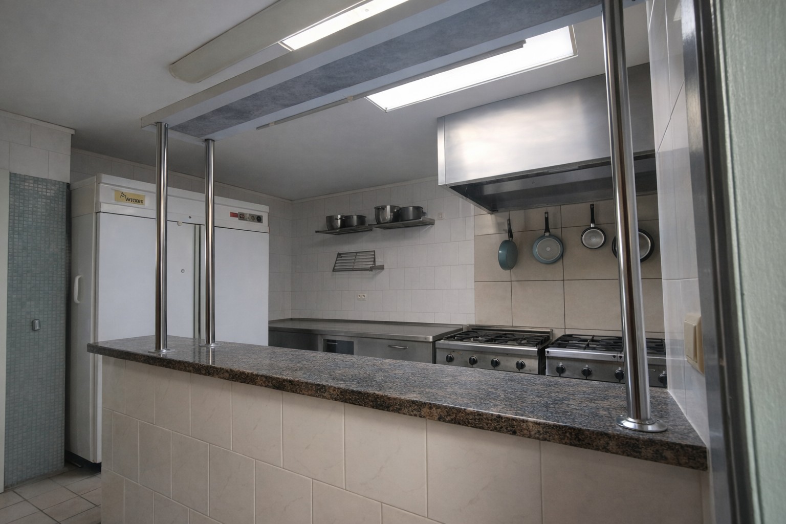 De handelszaak betreft een café met toog en zitplaatsen, industriële keuken, toiletten, dubbel lavabomeubel, enz…..