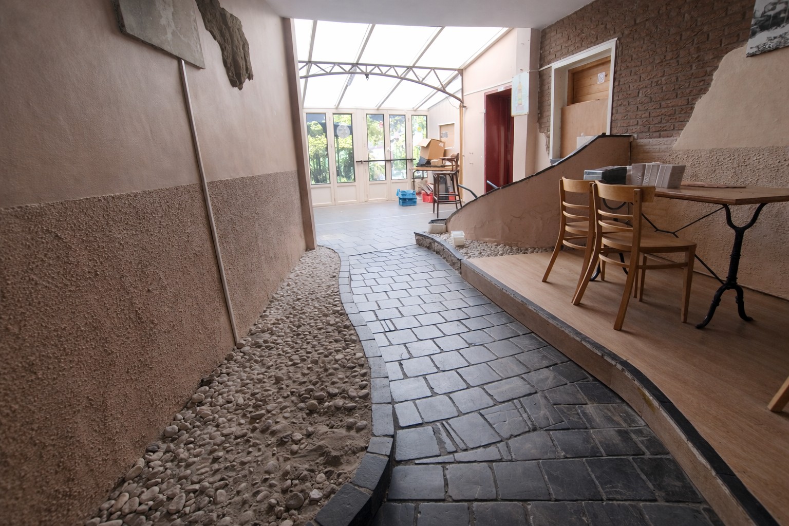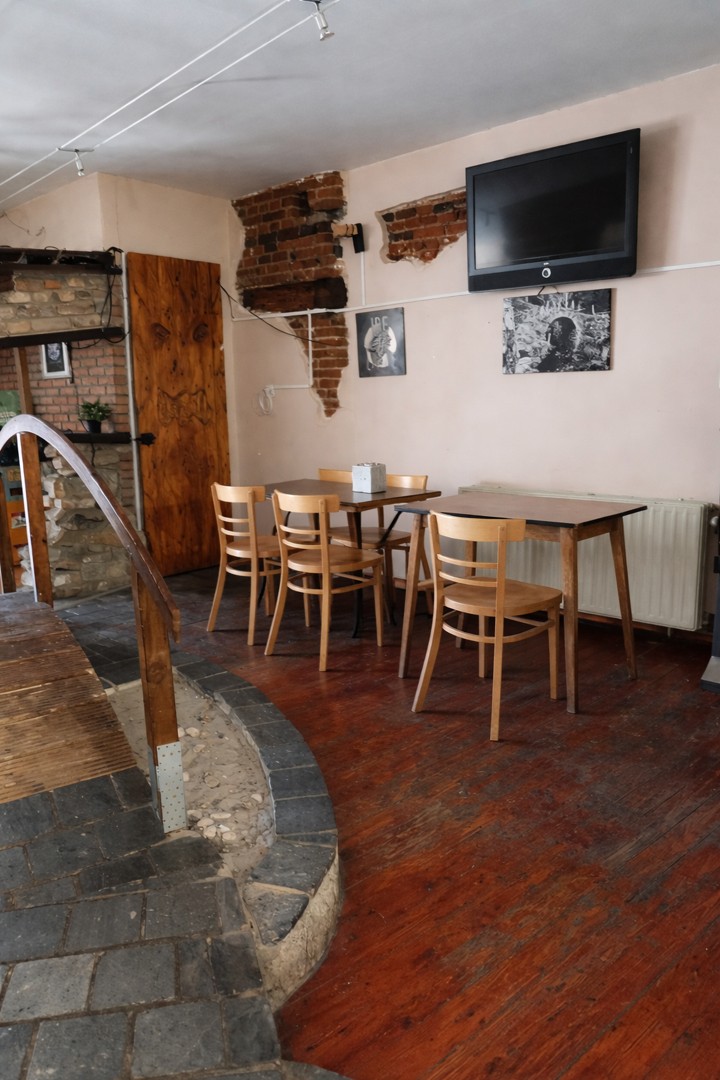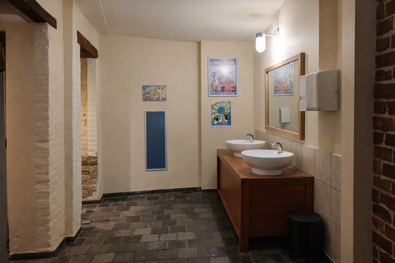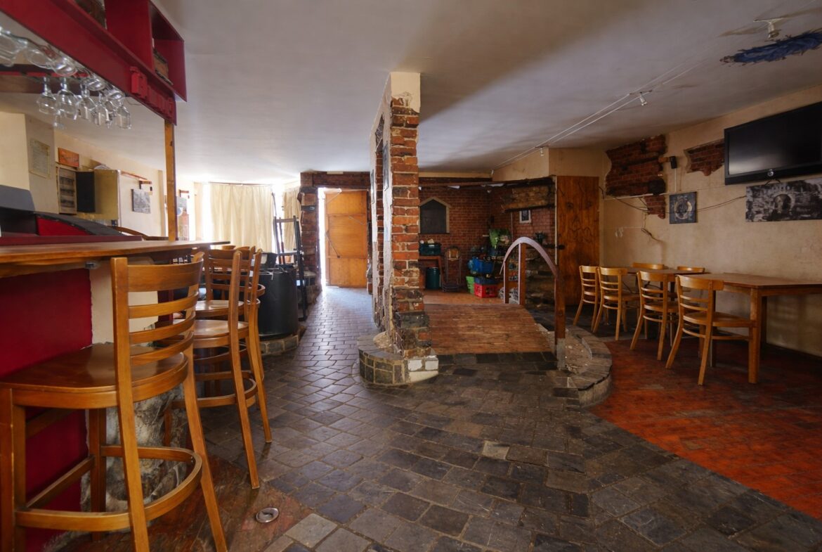 De handelszaak betreft een café met toog en zitplaatsen, industriële keuken, toiletten, dubbel lavabomeubel, enz…..