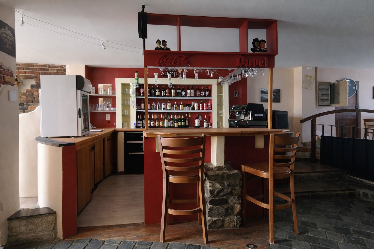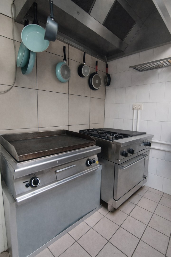 Le local commercial inclut un café avec bar et places assises, une cuisine professionnelle, des sanitaires, un évier double, etc.