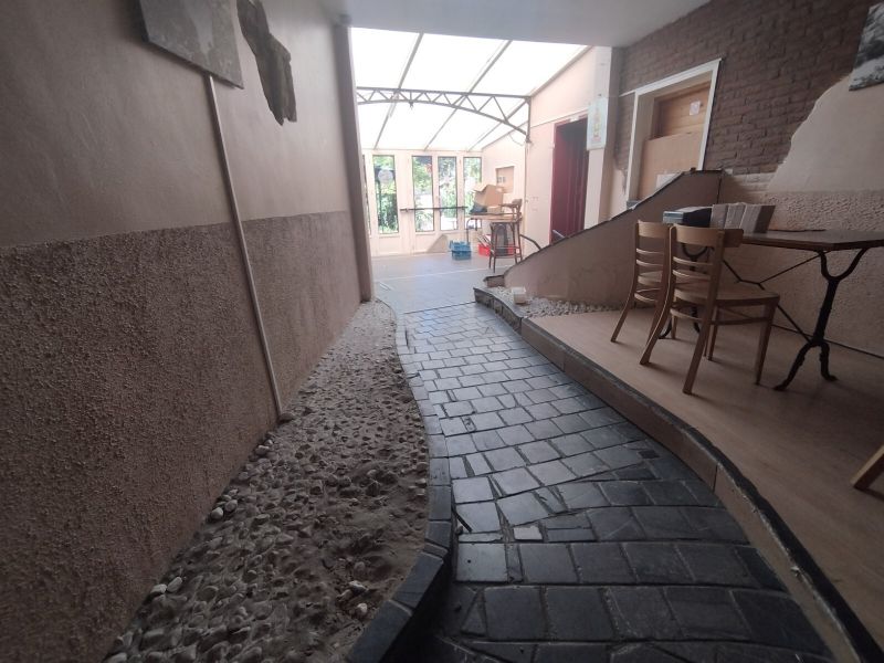 Le local commercial inclut un café avec bar et places assises, une cuisine professionnelle, des sanitaires, un évier double, etc.