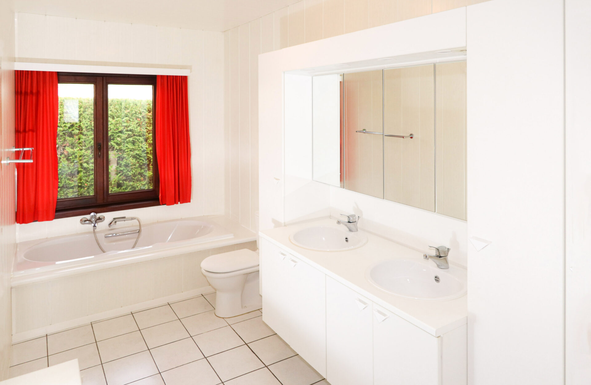 De badkamer heeft een dubbele wastafel, met veel plaats in kasten,