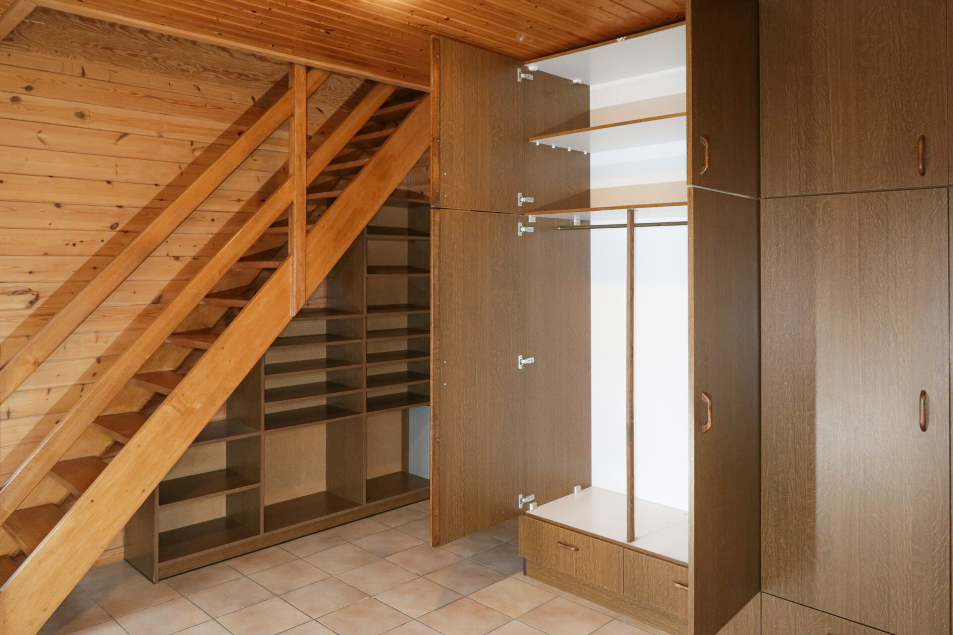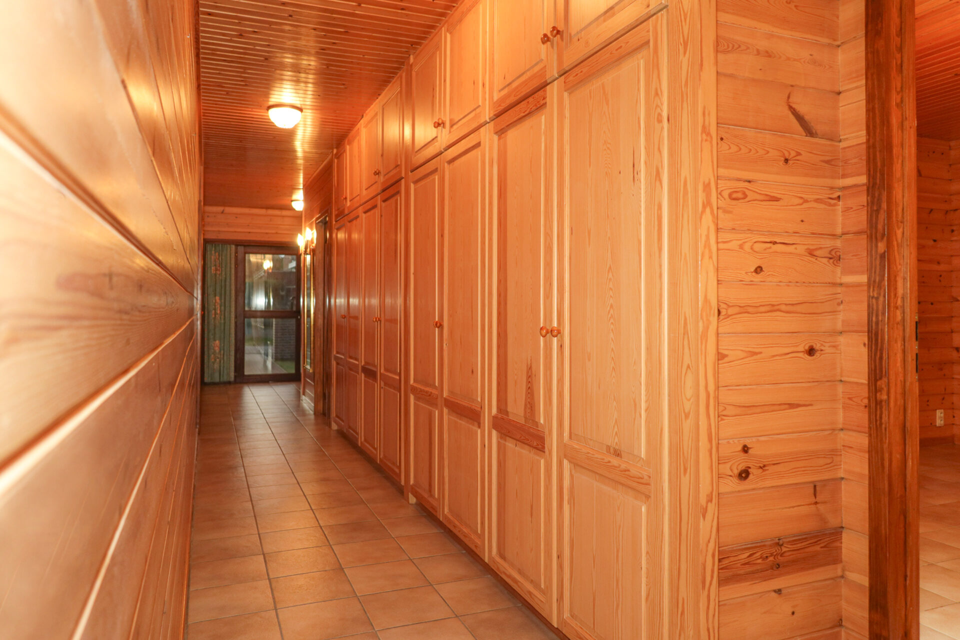 Een brede gang loopt door het huis en heeft over de hele lengte grote inbouwkasten.