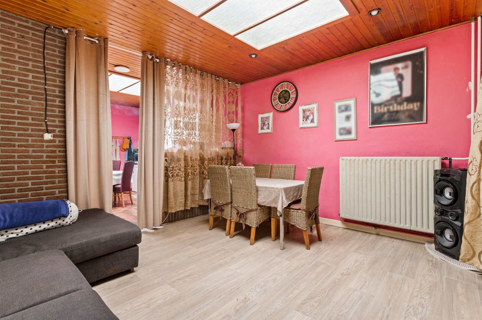 - Eetkamer: de eetkamer is een lichte en uitnodigende ruimte, dankzij het raam in het dak dat extra zonlicht binnenlaat. Hierdoor ontstaat een warme en aangename sfeer tijdens het eten of samenkomen met familie en vrienden. De ruimte biedt voldoende plaats voor een eettafel en stoelen, en kan naar wens verder worden ingericht, zodat het een comfortabele en gezellige plek in huis wordt.