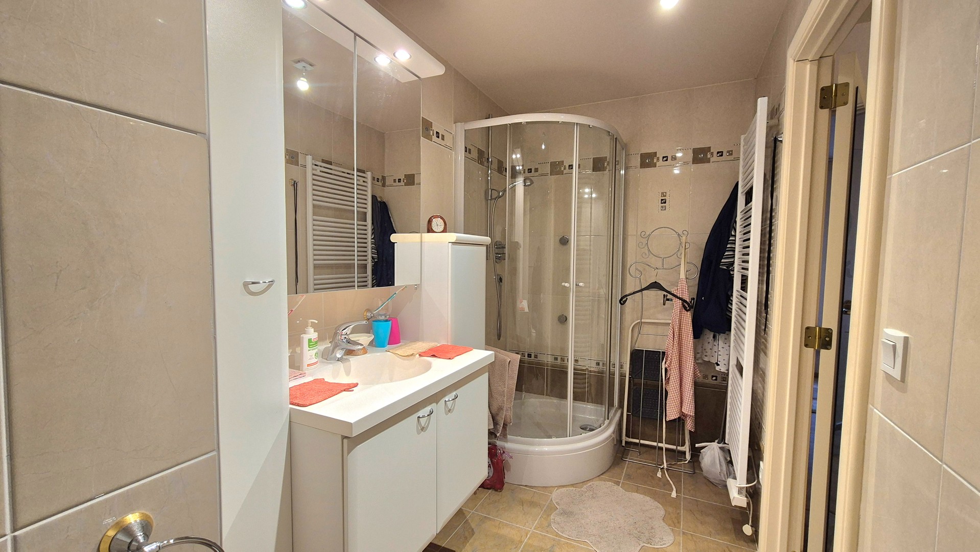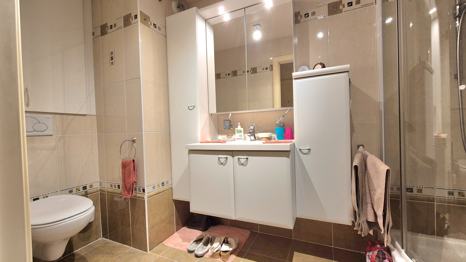 - Ruime badkamer met lavabomeubel, douche en toilet + zetelbed