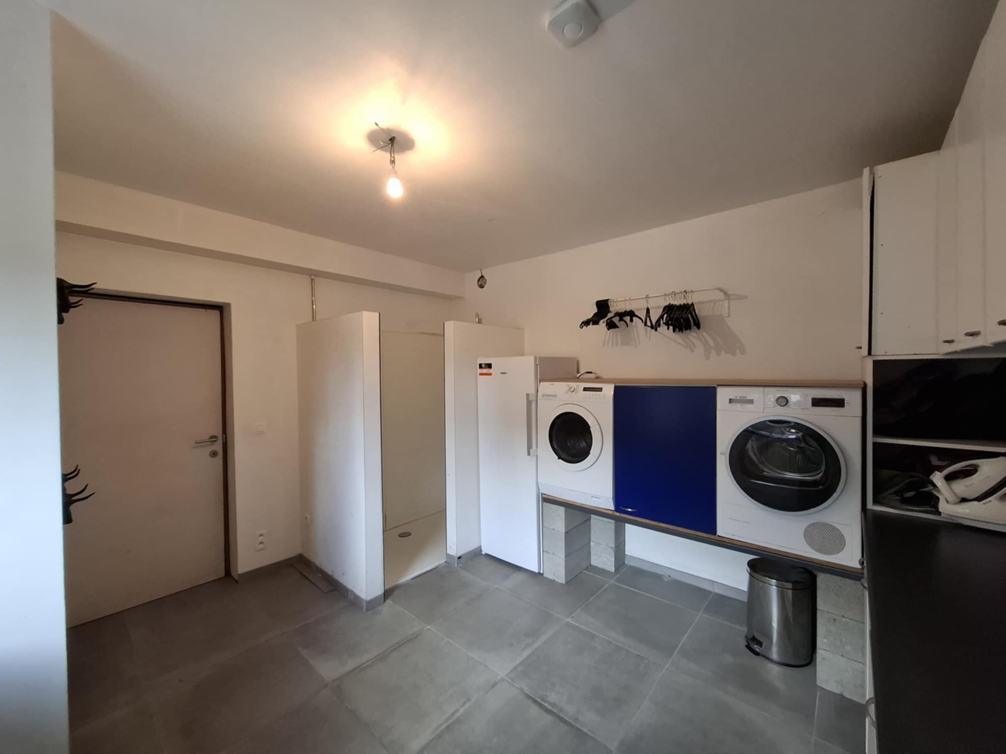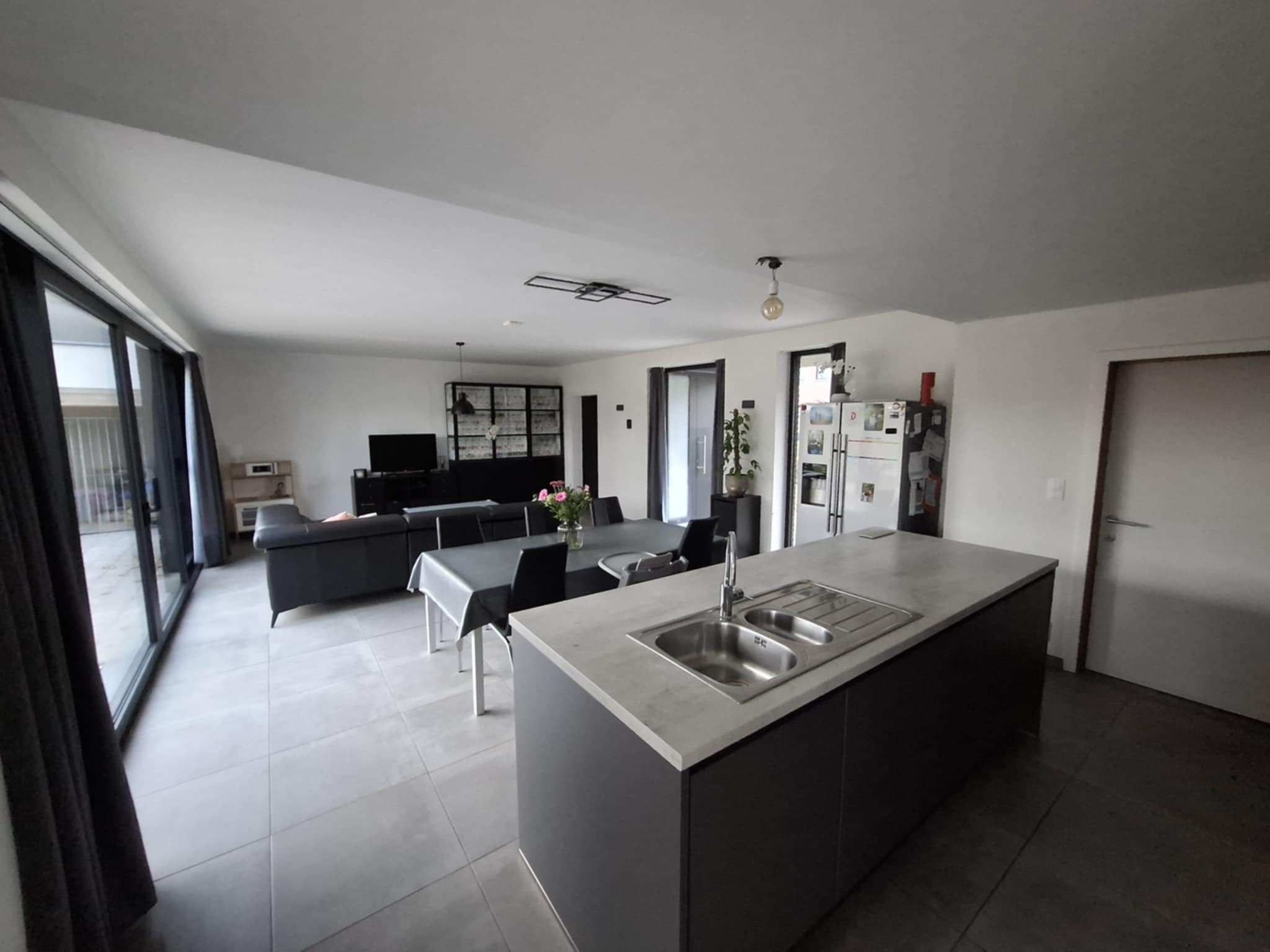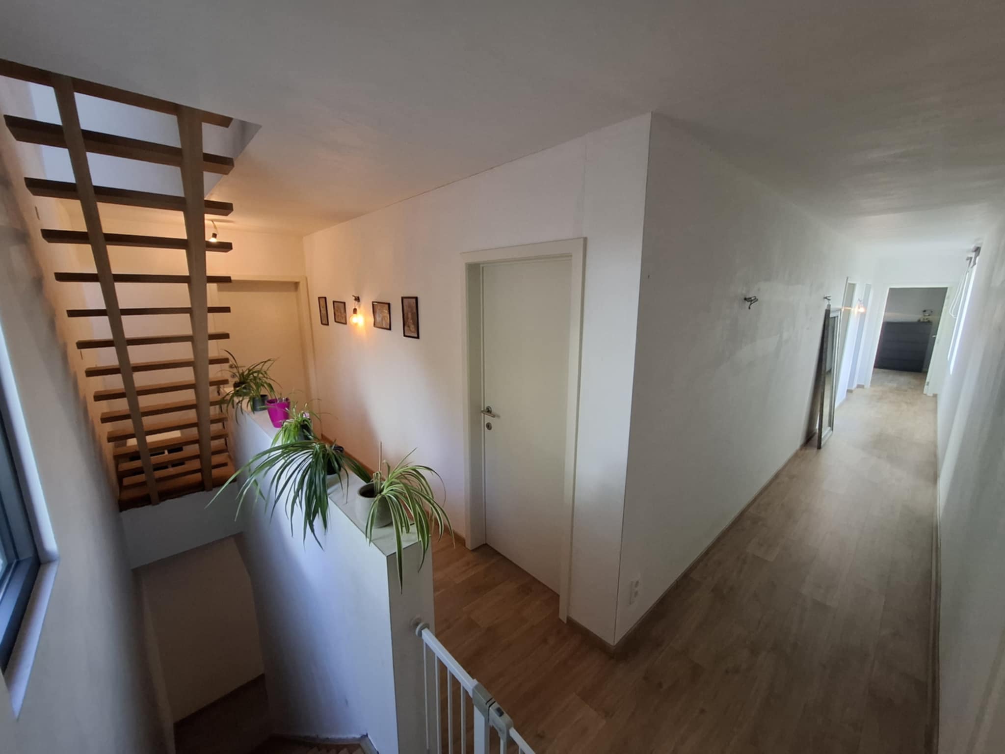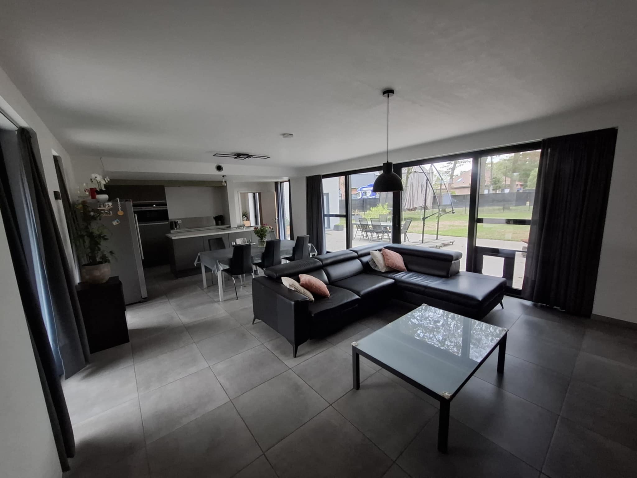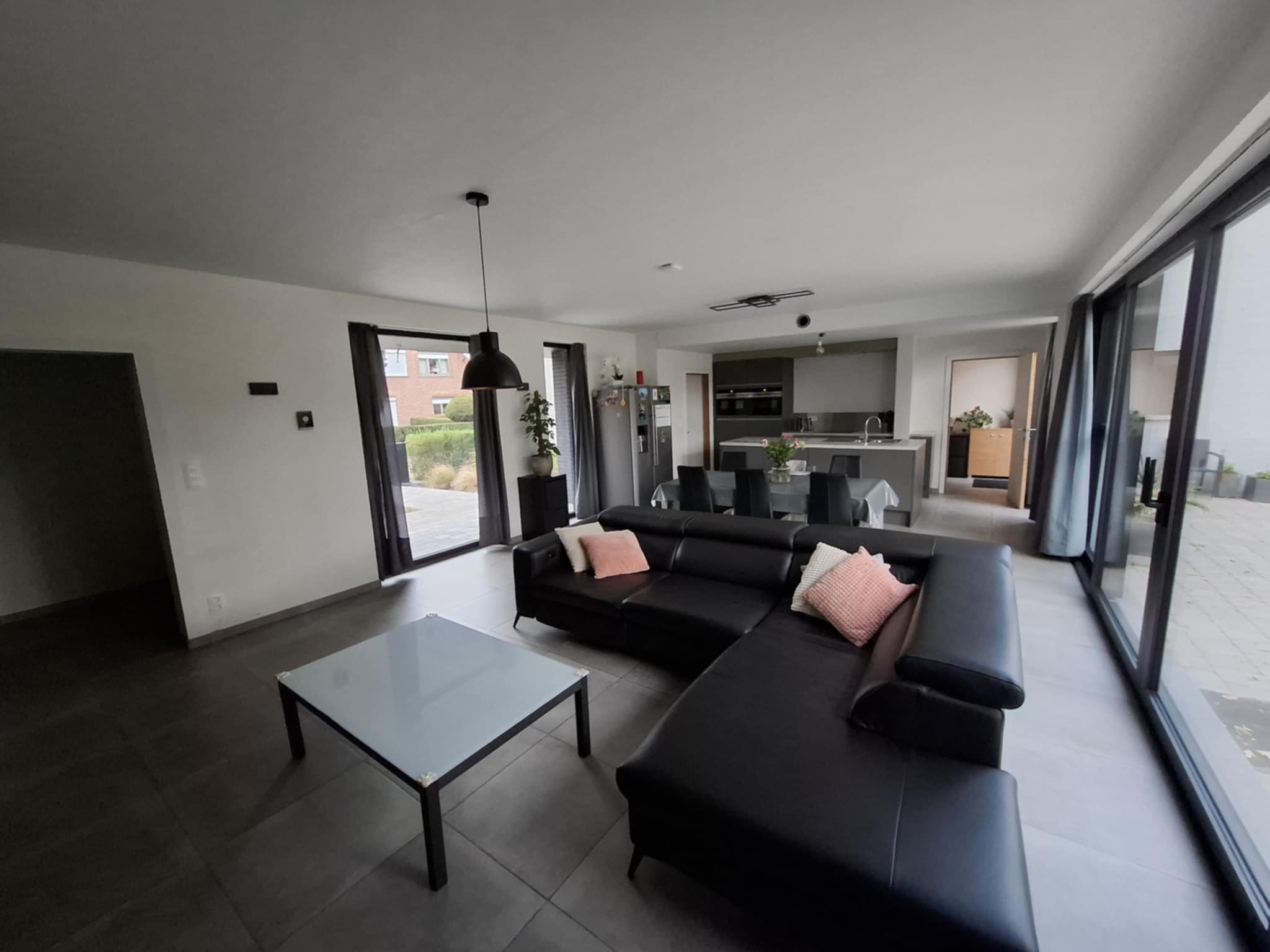 Via de inkomhal betreedt u de ruime en lichtrijke woonkamer, waar grote raampartijen uitkijken op de tuin. De vernieuwde vloeren met vloerverwarming zorgen voor een aangenaam wooncomfort in elk seizoen.