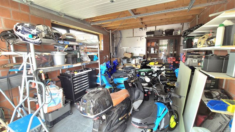 Bijhorende ZUIDGERICHTE tuin met groot terras, gazon, moestuin,… Toegankelijk ook via zijkant – afsluitbaar via een schuifpoort. Voorbij deze schuifpoort is er een privé oprit en bevindt zich de GARAGE.