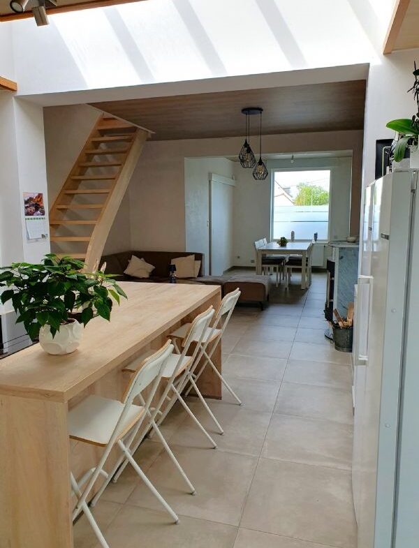 1ste VERDIEP: •Nachthal •2 mooie slaapkamers ZOLDER: •Vaste trap naar ruime 3de slaapkamer Divers: Woning werd volledig gerenoveerd met dubbele beglazing, nieuwe chauffageketel op gas (Wolf), conforme elektriciteit voor 25jaar. Regenpomp. Bruikbare vloeroppervlakte ca.99m² (indicatief volgens het PEB). PEB 1054 kWh/m² – UC005161 – Label G ( woning werd volledig gerenoveerd en nieuw EPC attest wordt nog aangeleverd. Bel ons op 056/72.48.93 voor een bezoek ter plaatse en reserveer alvast uw bezichtiging of kom gerust vrijblijvend eens langs. We leiden jullie graag even rond. (Ref. 17044). ———————————————————- Maison d’angle entièrement rénovée, idéalement située à Ploegsteert. Rez-de-chaussée : • Hall d’entrée spacieux • Toilettes invités avec lavabo • Pièce de vie lumineuse • Cuisine américaine moderne avec coin repas • Buanderie équipée d’électroménager neuf • Terrasse récemment aménagée • Beau jardin accueillant avec abri de jardin Premier étage : • Palier • 2 belles chambres • Salle de bains avec douche à l’italienne et lavabo Combles : • Escalier menant à une troisième chambre spacieuse Divers : La maison a été entièrement rénovée et dispose de double vitrage, d’une chaudière à gaz neuve (Wolf) et d’une installation électrique conforme aux normes pour 25 ans. Pompe à eau de pluie. Surface habitable d’environ 99 m² (à titre indicatif selon le PEB). PEB 1054 kWh/m² – UC005161 – Classe énergétique G (la maison a été entièrement rénovée et un nouveau certificat DPE sera fourni). Appelez-nous au 056/72.48.93 pour une visite sur place et réservez votre visite. Vous pouvez également passer nous voir sans engagement. Nous serons ravis de vous faire visiter. (Réf. 17044)