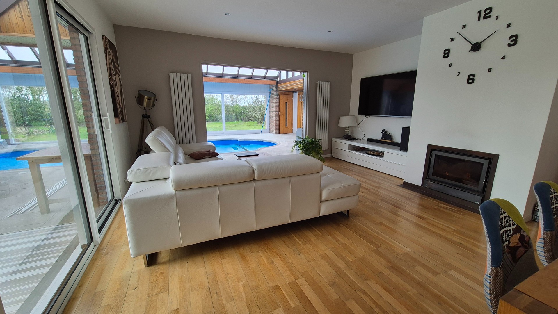JOURNÉE PORTES OUVERTES SAMEDI 25/04 de 13h30 à 14h30. Villa spacieuse et lumineuse avec vue sur la campagne, cuisine ouverte, 4 chambres et piscine intérieure. (Réf. 17202)