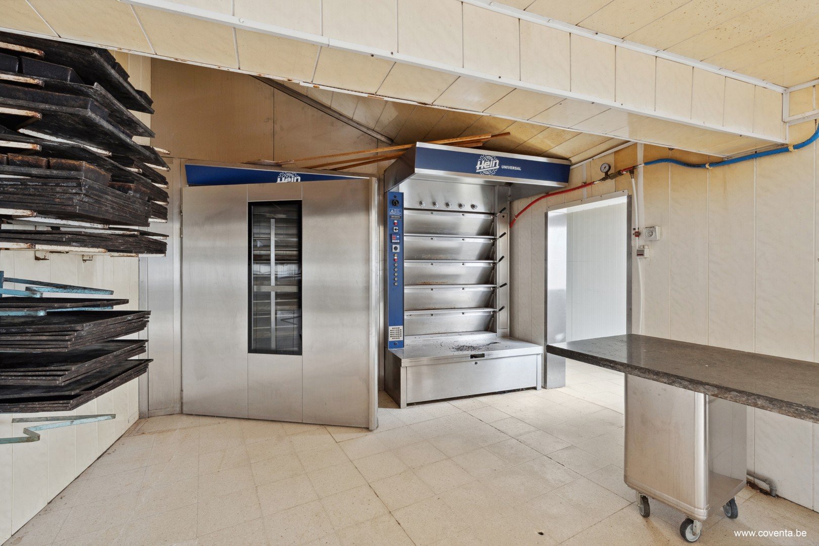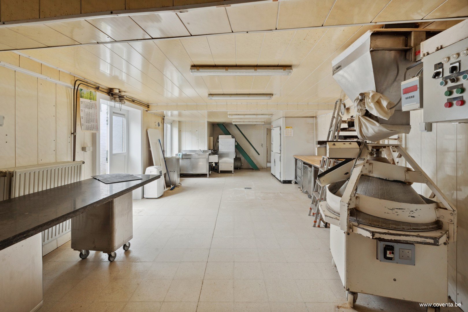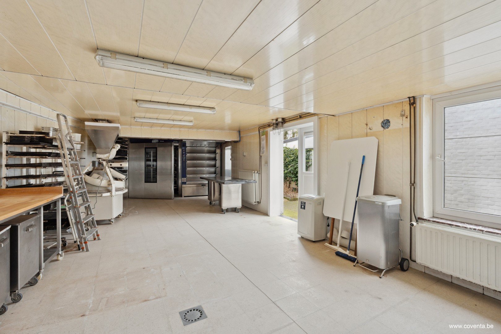 gelijkvloers: Grote dubbele garage met plaats voor minstens 2 wagens en extra opslagruimte, eetkamer met open keuken, gastentoilet, voormalige winkelruimte (voormalige bakkerij) ideaal voor een zelfstandige activiteit, kelder, atelier van +-65m² met betonnen zolderverdieping (ideaal als werkruimte of opslag);