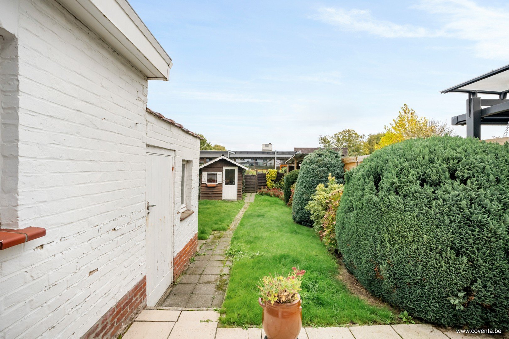 Tuin: Terras met berging, tuin met tuinhuis, uitweg achteraan en 2 staanplaatsen op de oprit.