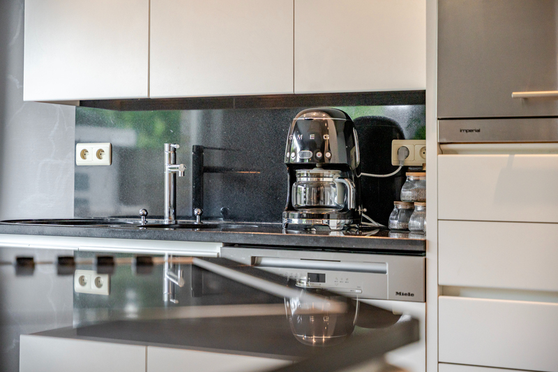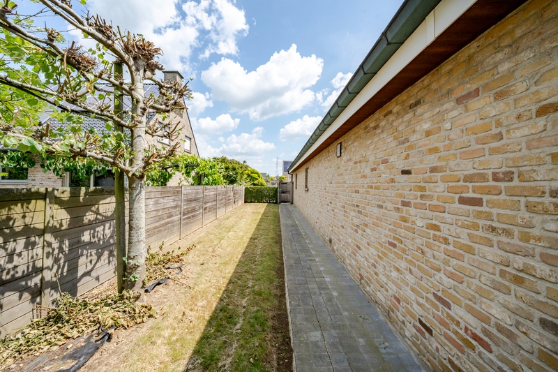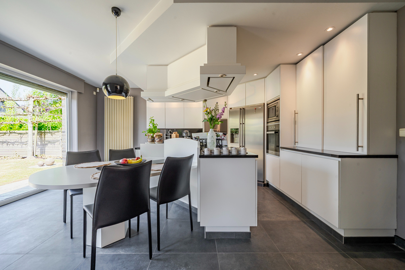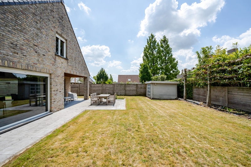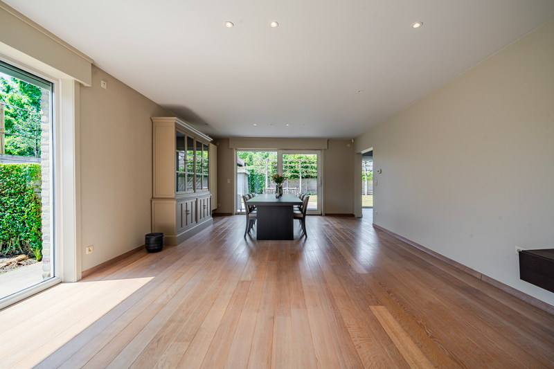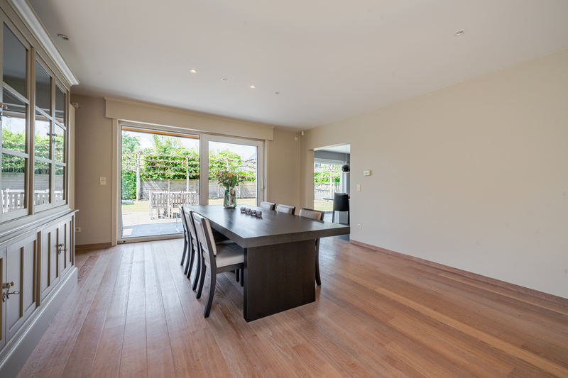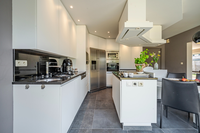 De leefkeuken met zicht op de zonnige tuin is volledig uitgerust met hoogwaardige Miele-toestellen en beschikt over ingebouwde extra’s zoals een friteuse en grill – perfect voor de hobbykok. Aansluitend is er een koele berging. Verder vindt u op het gelijkvloers een ruime bureauruimte (of slaapkamer), een luxueuze badkamer met marmeren afwerking (ligbad en douche), én een inpandige garage.