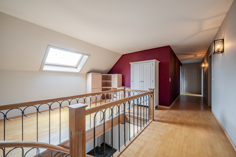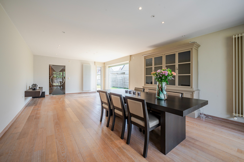 Bij het binnenkomen betreedt u een imposante inkomhal met een unieke houten trap die meteen de toon zet. De ruime, lichtrijke woonkamer is afgewerkt met kwalitatieve parket en nodigt uit tot gezellige momenten.