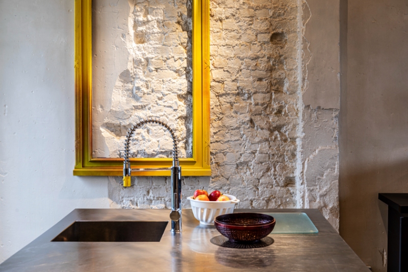 Via een prachtige traphal kom je op de eerste verdieping, waar een open leefruimte zich uitstrekt over oude parketvloeren. De industriële keuken sluit naadloos aan bij de sfeer: robuust, karaktervol en perfect voor gezellige diners. De deels open muren onthullen de authentieke bakstenen, wat een ruw maar warm contrast biedt.
