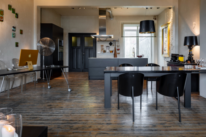 De begane grond is momenteel ingericht als een karaktervolle fotostudio, compleet met kitchenette en sanitaire voorzieningen. De hoge plafonds en grote raampartijen maken het een inspirerende plek, perfect voor ondernemers, creatievelingen of wie droomt van een unieke woon-werkcombinatie.