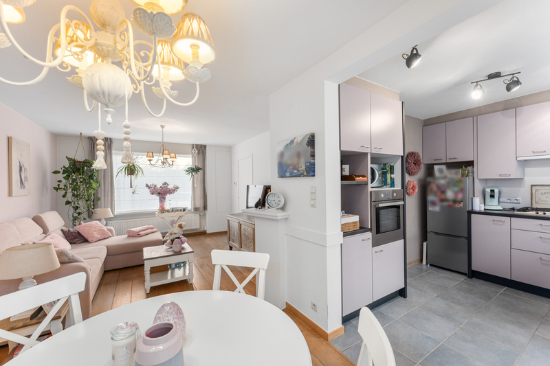 Bij het binnenkomen voel je je meteen thuis. De lichtrijke en sfeervolle leefruimte vormt het hart van de woning en straalt warmte en gezelligheid uit. Aansluitend vind je de volledig ingerichte keuken, die in open verbinding staat met de tuinkamer/eetruimte.
