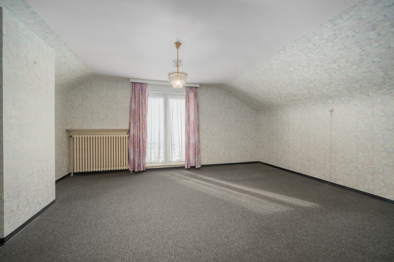 Op de eerste verdieping wachten u twee bijzonder ruime slaapkamers en een badkamer. Achteraan het huis bevindt zich een zonnig terras dat uitgeeft op de grote tuin met bijgebouwen – waar u na het aanlegger ervan kan genieten van een oase van rust en groen.