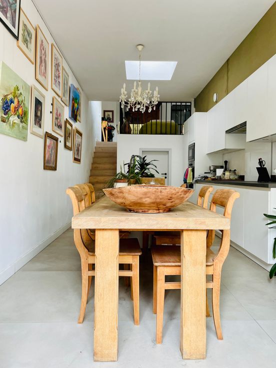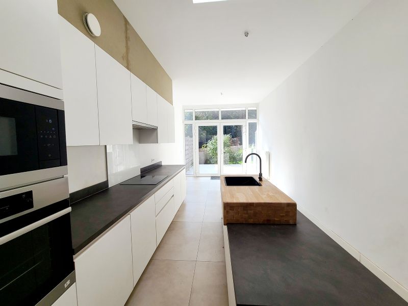 Beschikt over een ruime living en een heel ruime keuken met uitzicht op het grote terras en de tuin via panoramische terrasdeuren.