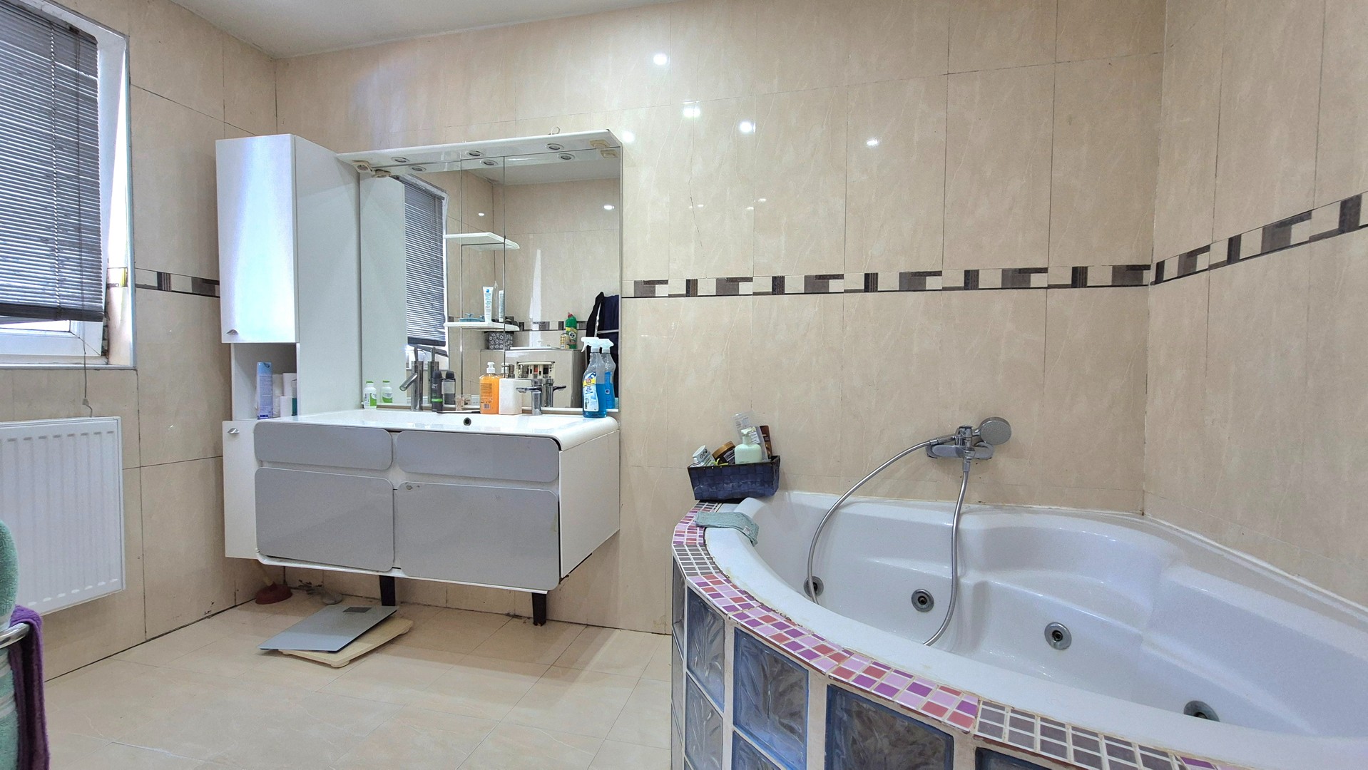 - Badkamer – beneden – met ligbad, decoratief mozaïekwerk, lavabo met meubel