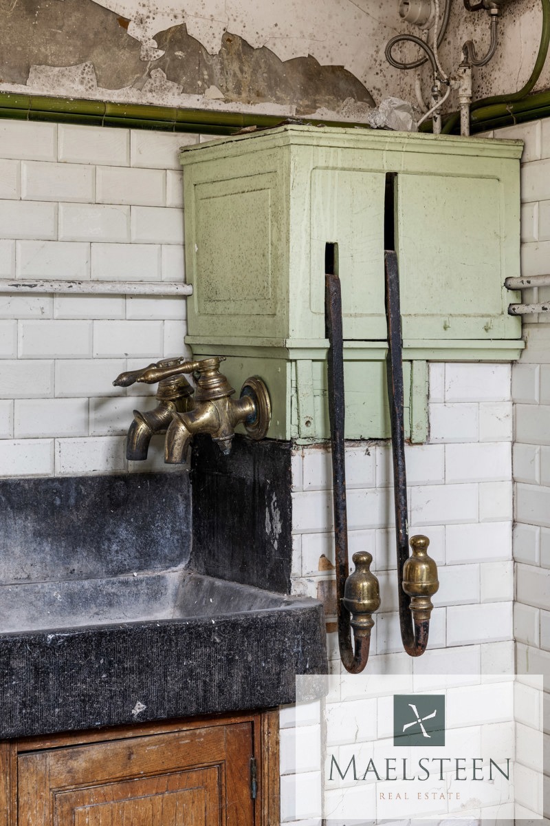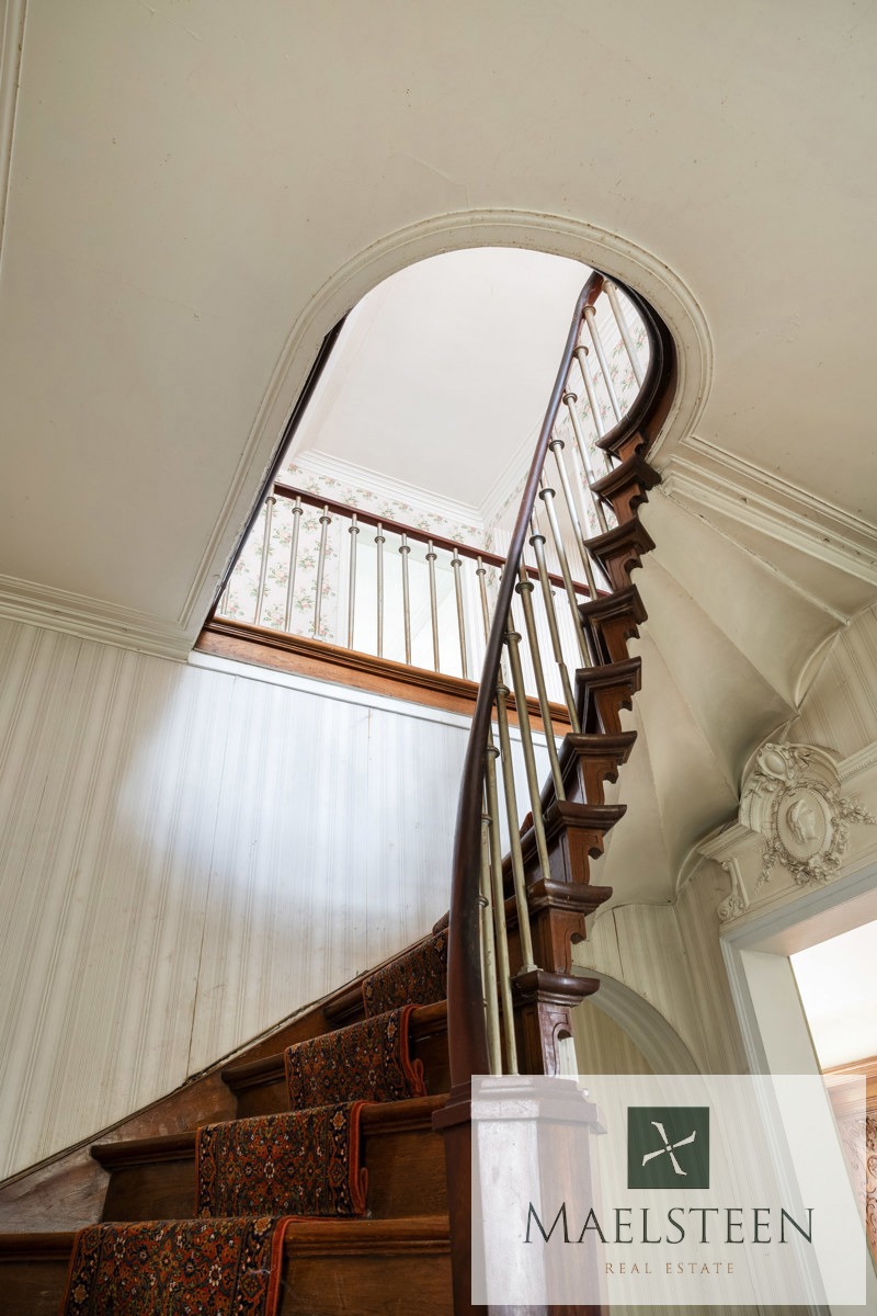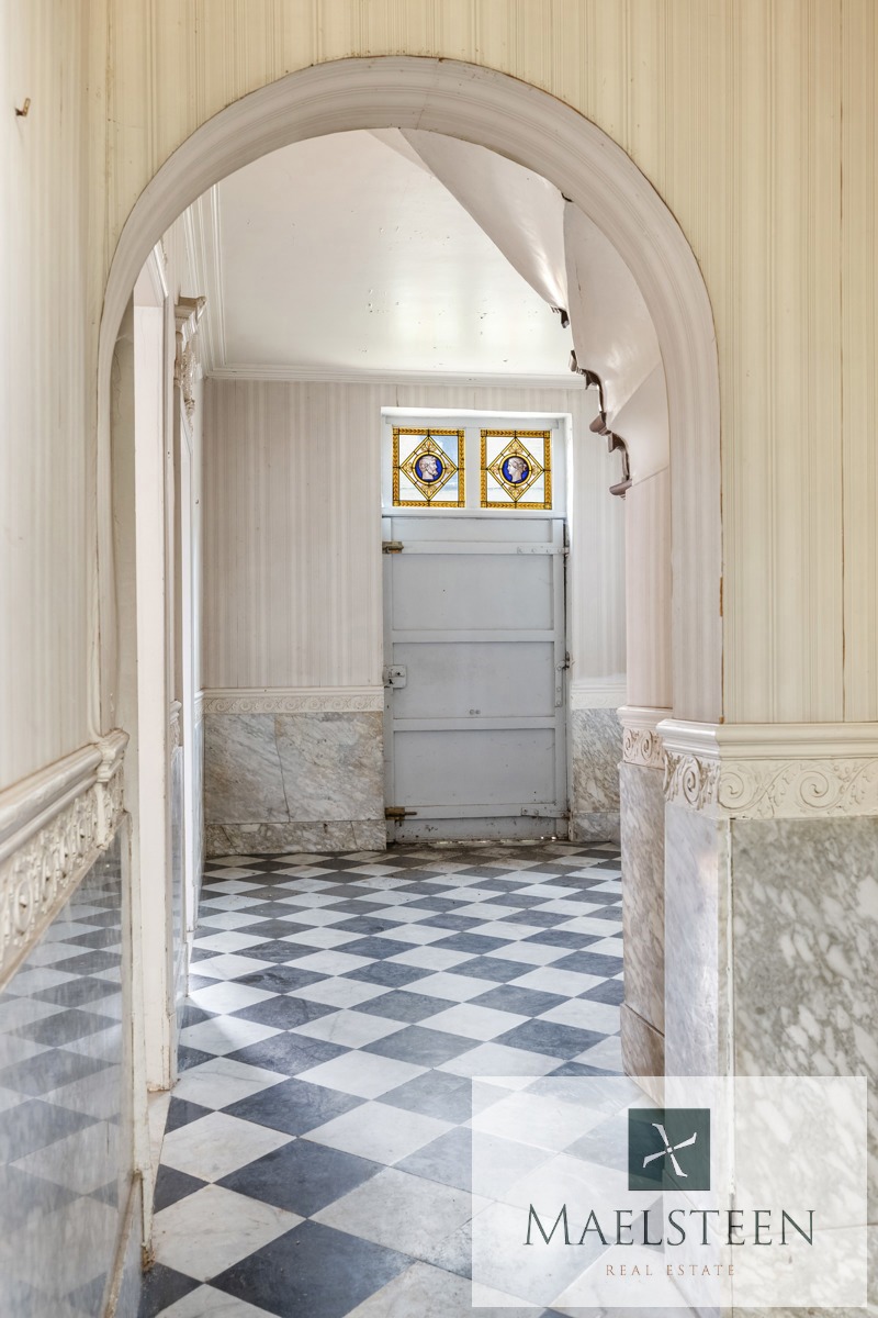Hoofdinkom met majestueuze trappenhal centraal in de woning. Via deze inkom is een direct toegang naar de tuin. De verschillende salons met prachtige authentieke elementen en hoge plafonds werden rond deze centrale inkom ingetekend. Een tweede (diensten)inkom vindt u rechts in de woning. Deze geeft een rechtstreekse toegang naar de keuken, met bijkeuken en extra opslafgruimte.