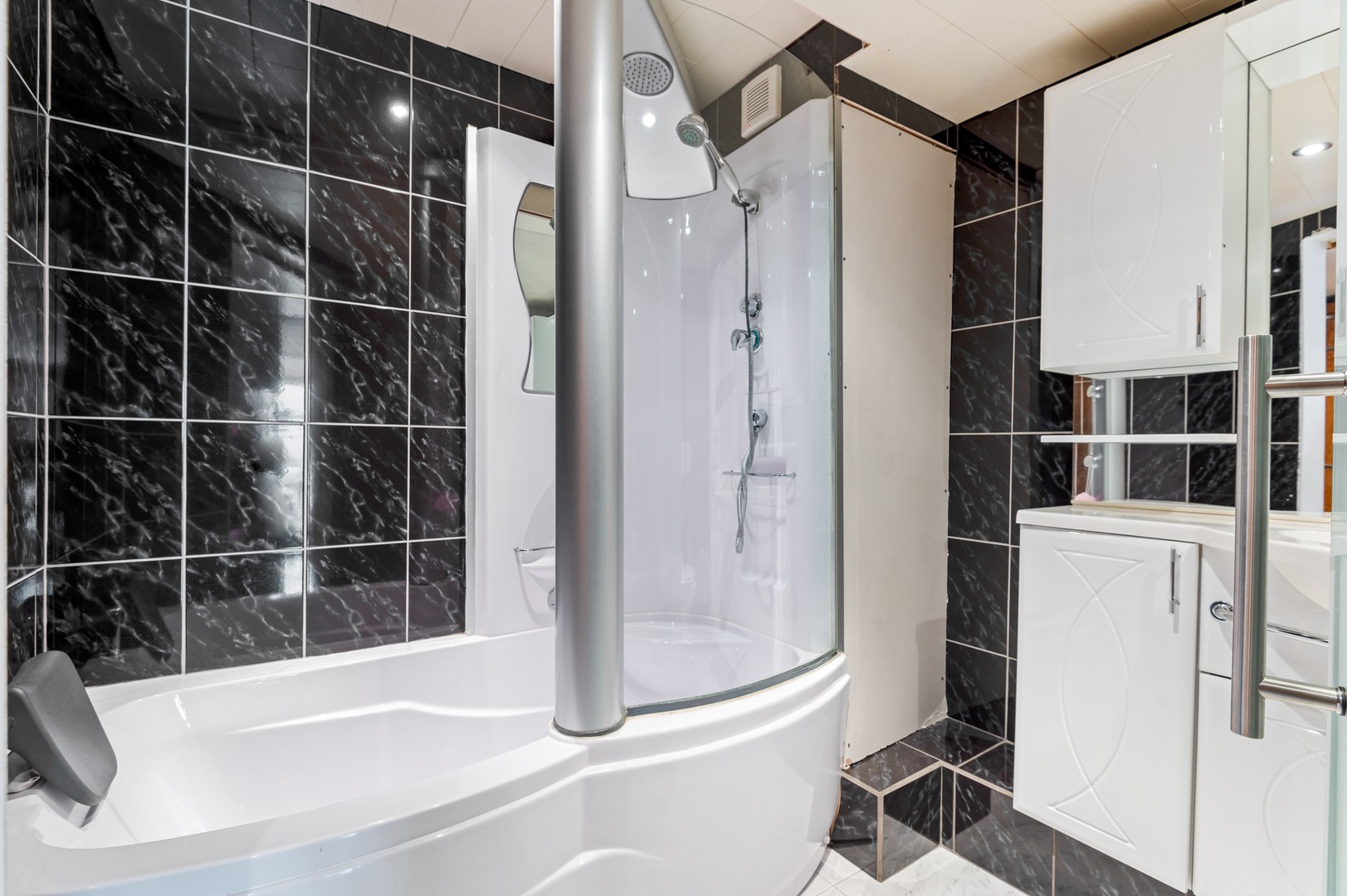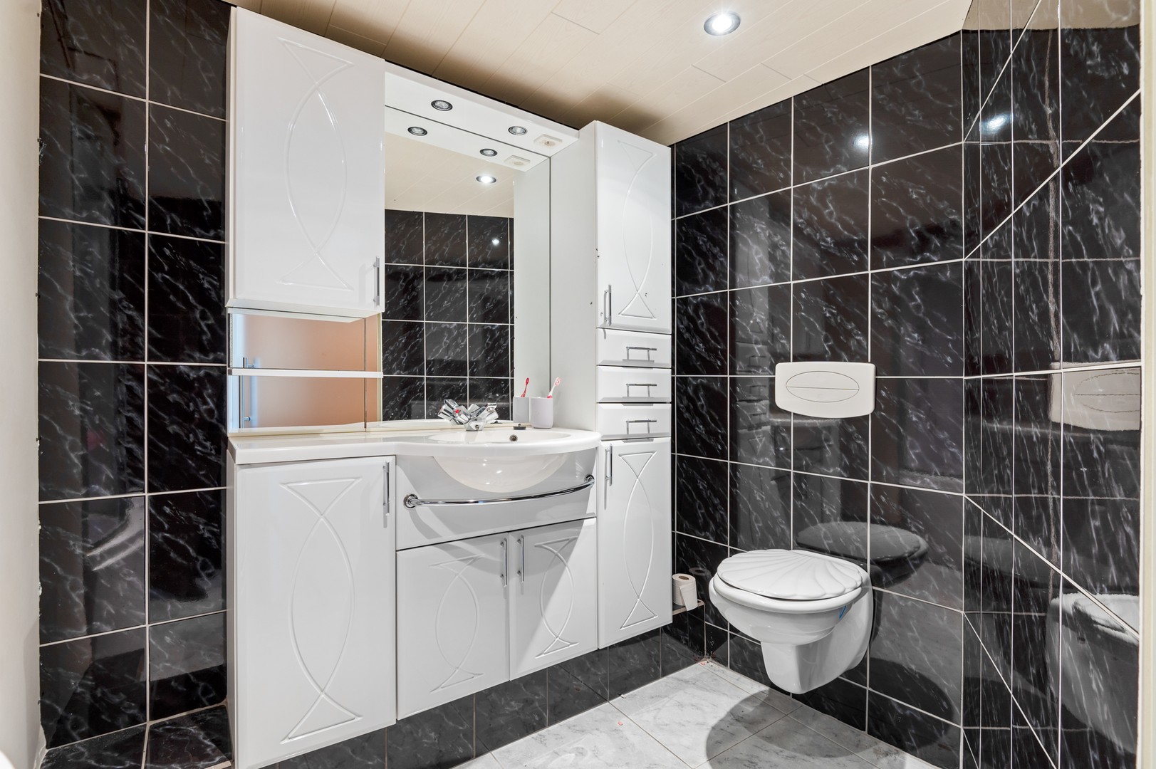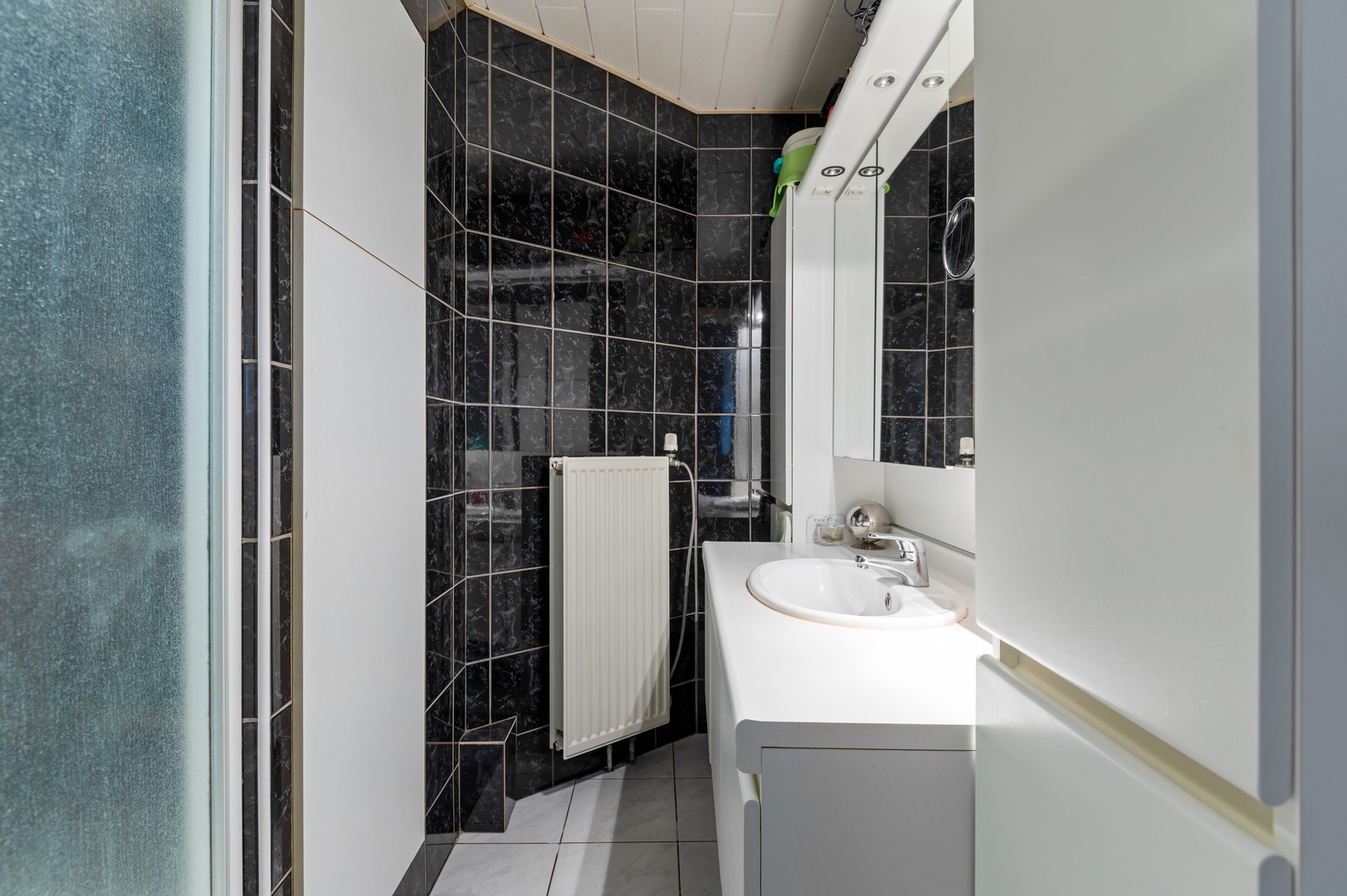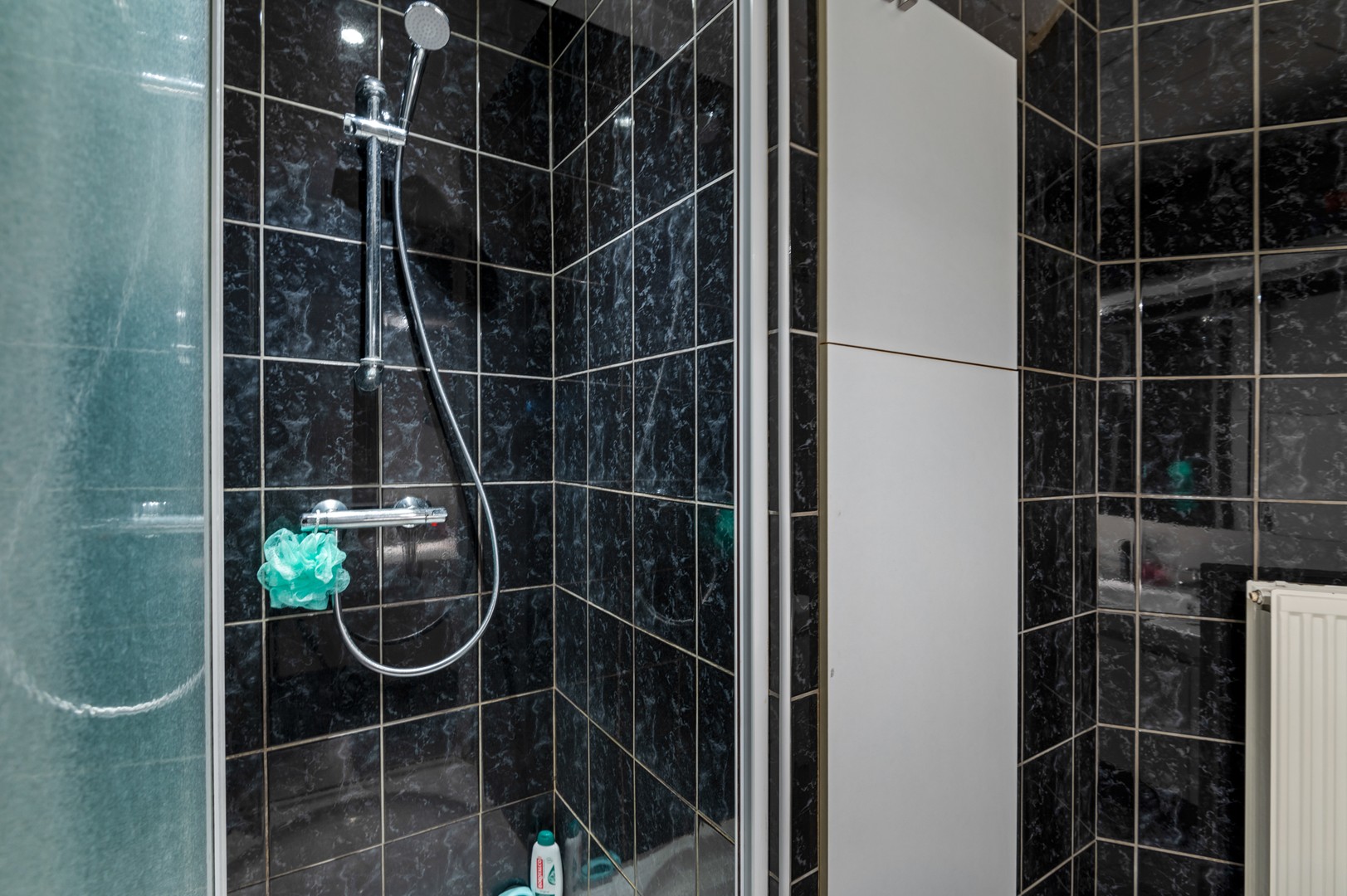 - Badkamer: de badkamer is voorzien van een wandmeubel met wastafel en inloopdouche. Bovendien is de badkamer volledig betegeld en dus makkelijk om schoon te maken en te onderhouden.