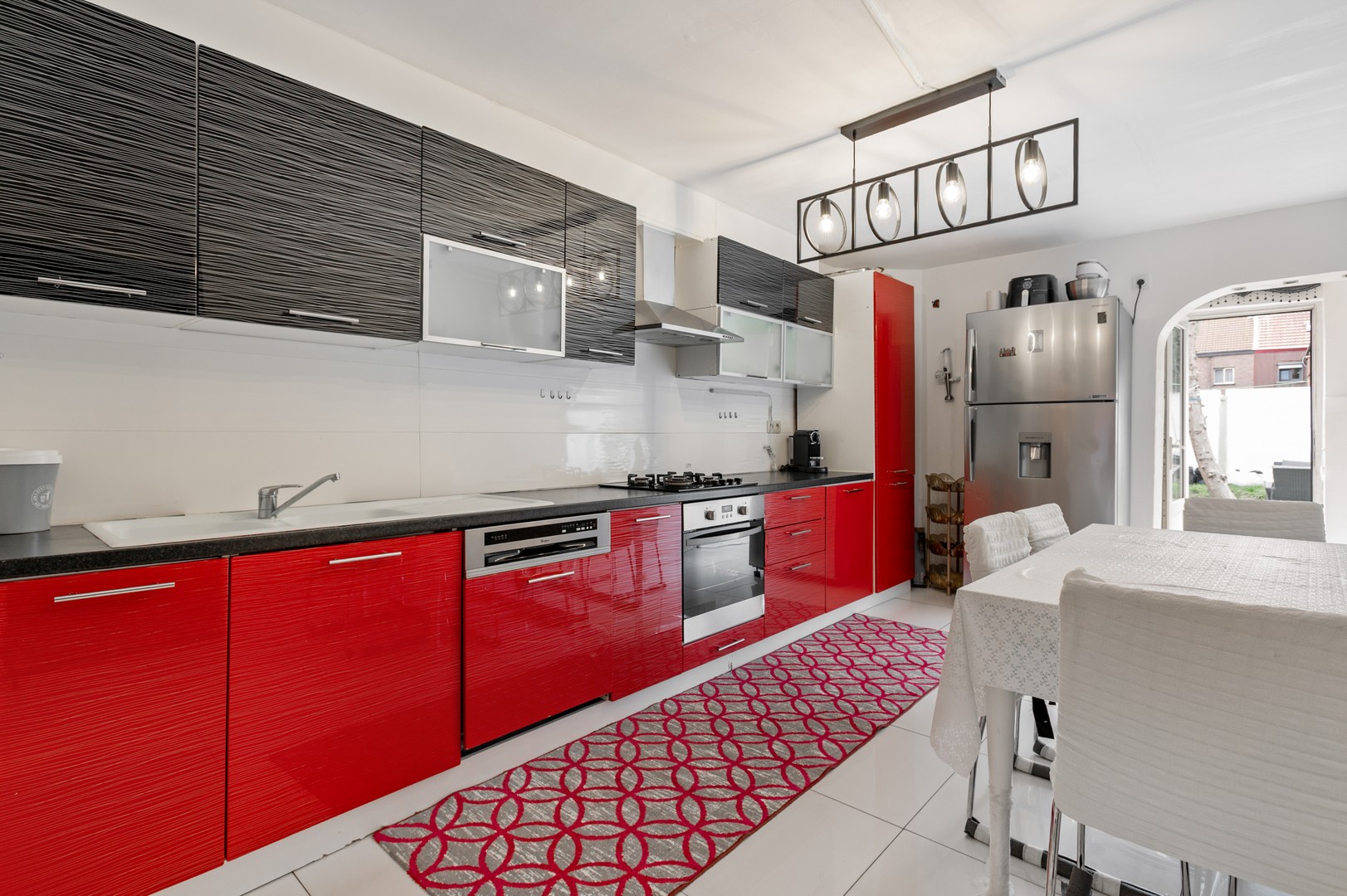 - Keuken: de keuken staat, via twee doorgangen in verbinding met de leefruimte. Zo profiteert de kok des huizes mee van het licht, de ruimte en de gezelligheid van de woonkamer. Dankzij de kasten langs beide zijden – zowel boven als onder – is er volop plaats voor etenswaren, potten en pannen. De keuken is uitgerust met een gasfornuis, afzuigkap, dubbele spoelbak, oven en vaatwasser.