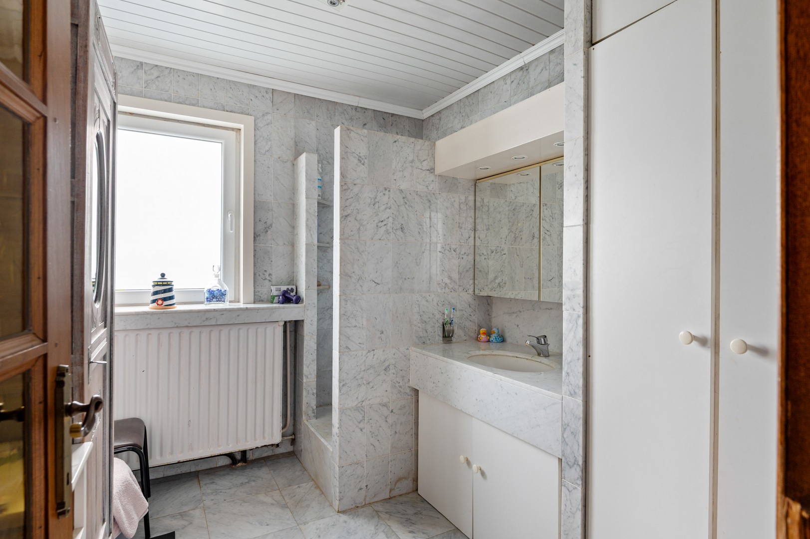 - Badkamer: in deze authentieke badkamer, volledig voorzien van marmer tegels kom je helemaal tot rust. Deze badkamer is voorzien van een ruime douche, een eenpersoonslavabo, een spiegelkast en enkele ingebouwde kasten. Verder voorziet de badkamer voldoende ruimte om zelf nog een kast toe te voegen indien gewenst.