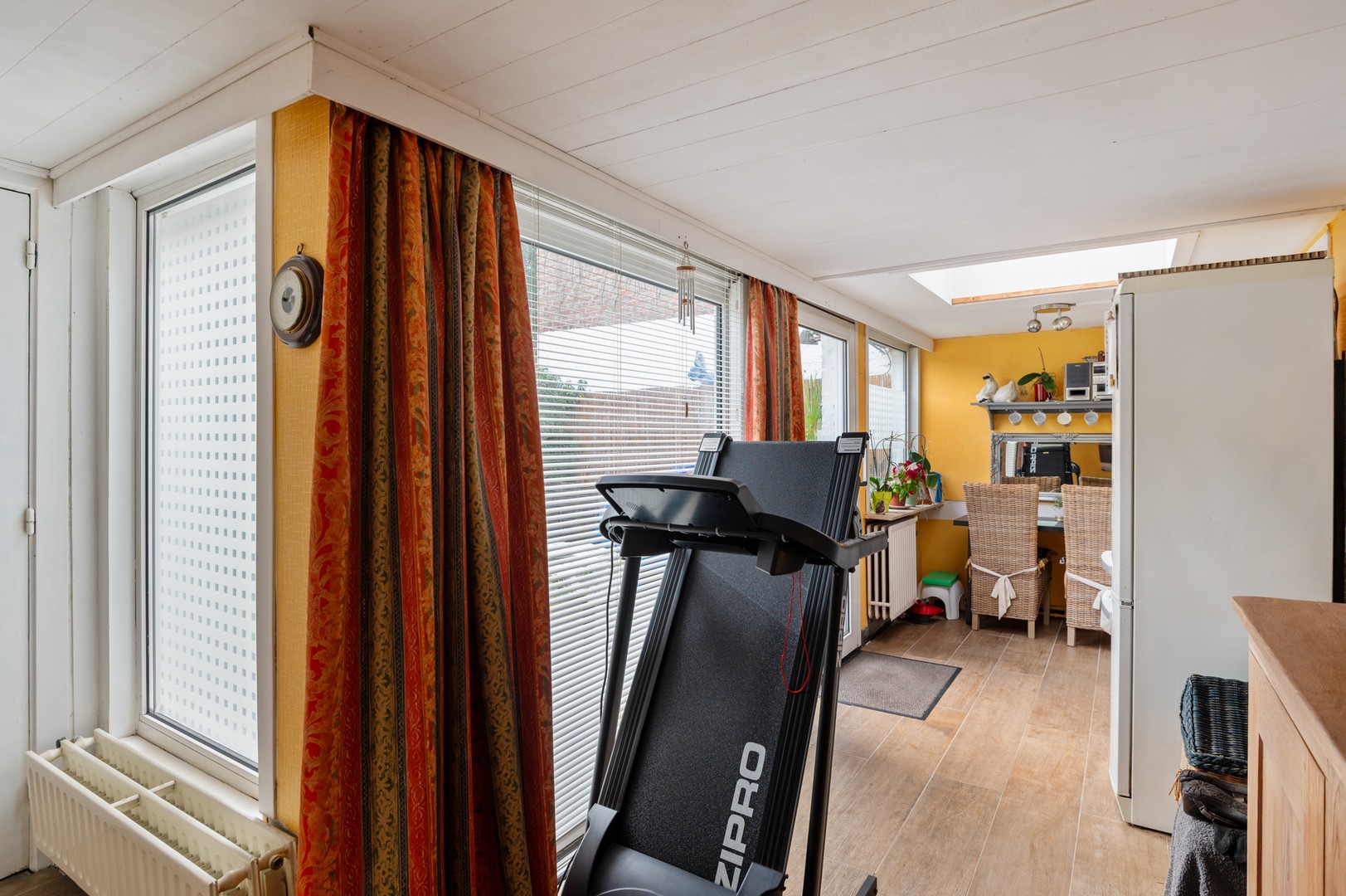 - Aanbouw: achter de leefruimte en keuken is een zonnige aanbouw voorzien. Hier werd momenteel de koelkast van de keuken voorzien, en is voldoende plaats om in te delen als leeshoek, extra eetkamer,…. Deze aanbouw is voorzien van een grote schuifraam die toegang tot de tuin verleent, en heeft ook een dakkoepel voor maximale lichtinval. In deze aanbouw werd een apart toilet, voorzien van een lavabo geïnstalleerd.