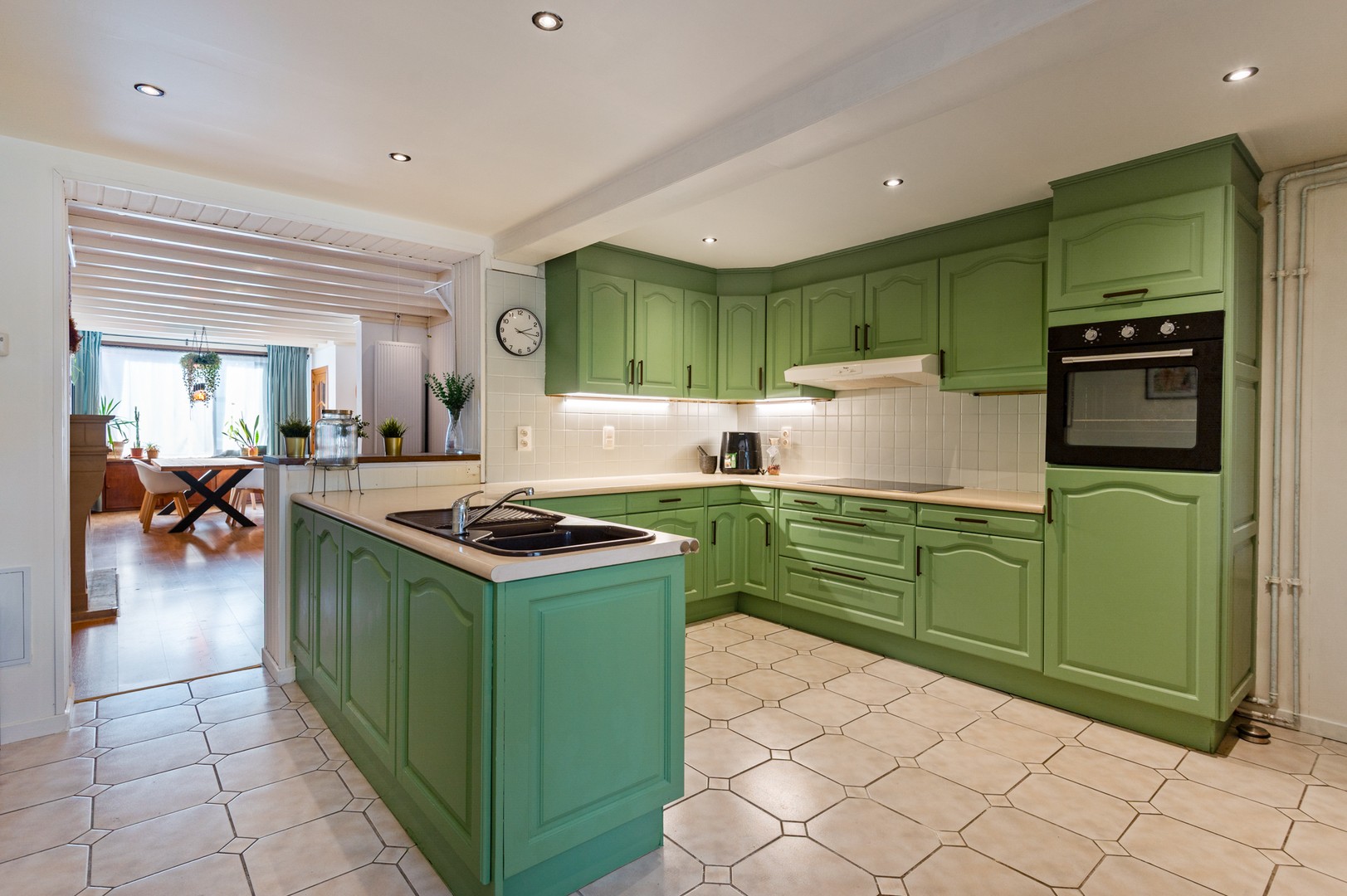 - Keuken: vanuit de leefruimte wandel je door naar de gezellige, landelijke keuken. Die is uitgerust met een keramisch kookvuur, dampkap, koelkast, oven, dubbele spoelbak en vaatwasser. Aansluitend vind je een ruime berging en wasplaats met apart gastentoilet.