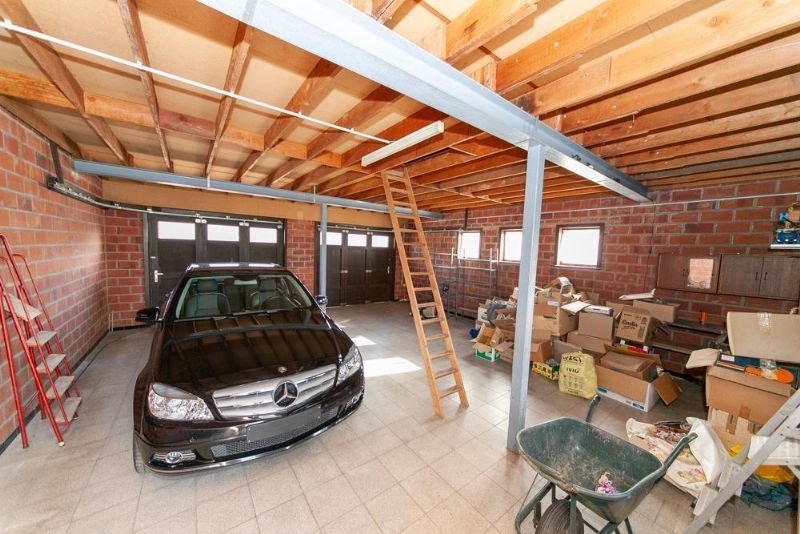 Op de gelijkvloerse verdieping vind je een inkomhal, gezellige woonkamer, keuken met eetplaats, bijkeuken/wasplaats, een slaapkamer (of bureauruimte), een stookruimte, een toilet, een veranda, dubbele garage met zolderruimte en grote tuin.