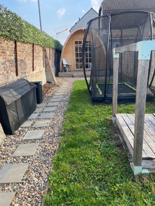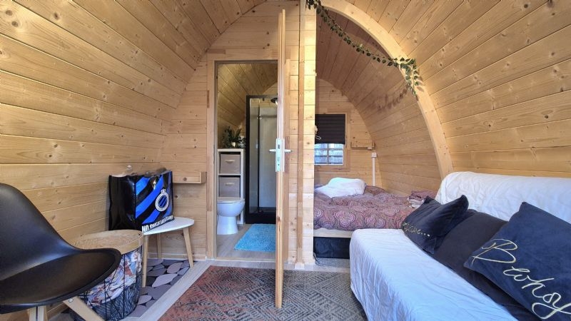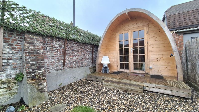 In de achtertuin bevindt zich een volledig afgewerkte camping-pod (ideaal ook als verhuur Airbnb met het toeristische centrum van Brugge kortbij, ook de nabijheid van Polders en Kust voor wandel- en fietstochten als troef,…) voorzien van: