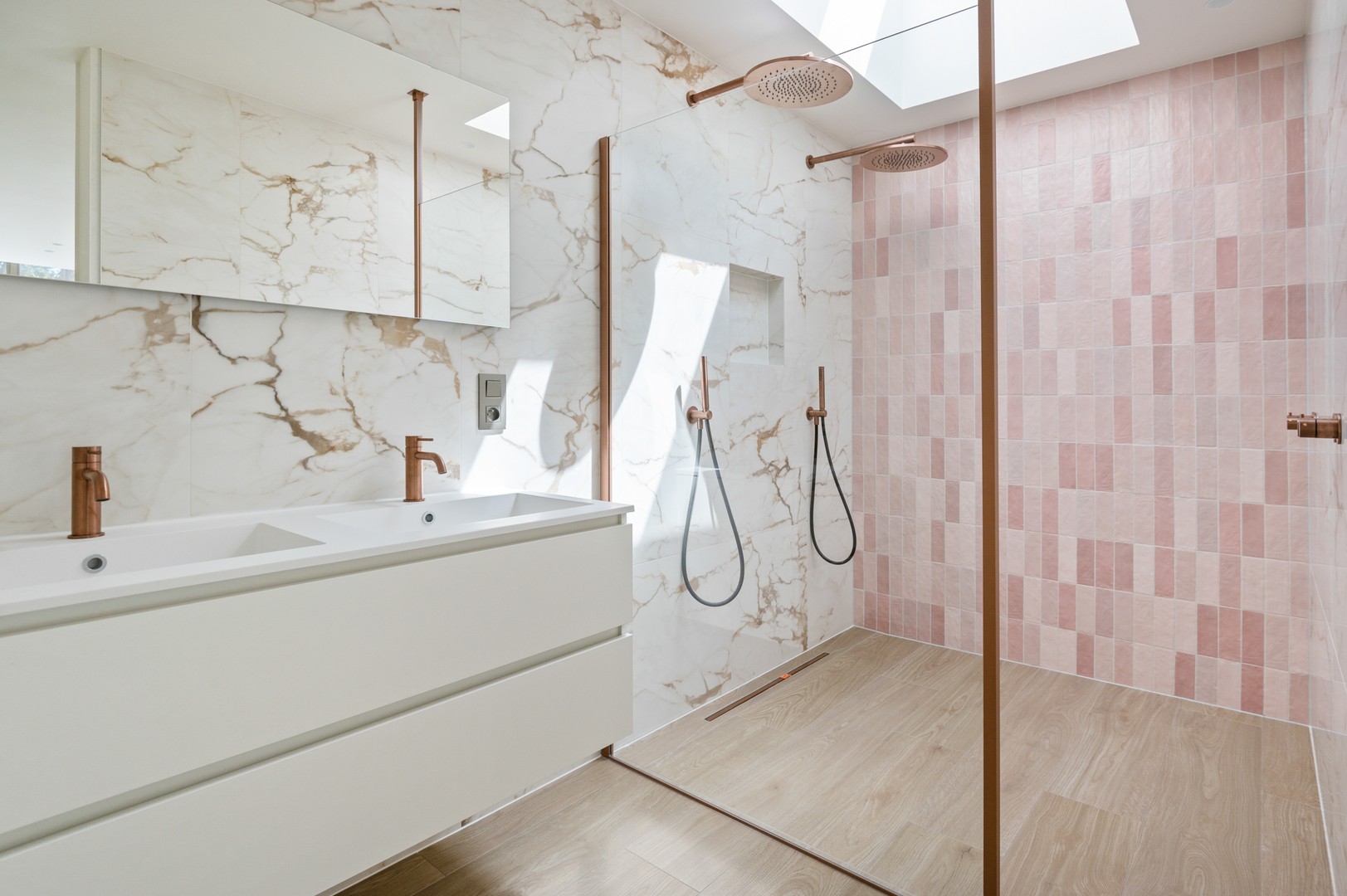 - Masterbedroom met ensuite badkamer: een mooie ruimte van ca. 21 m², grote ramen met een prachtig zicht op de tuin en een royale badkamer – dat moet de masterbedroom zijn. De badkamer op deze verdieping heeft een dubbele inloopdouche zoals u die in de interieurbladen vindt: met prachtige reliëftegels tegen de muur, 2 enorme regendouchekoppen en plaats voor het hele gezin. Verder is de badkamer voorzien van een groot wandmeubel met dubbele ingebouwde wastafel, een spiegel over de volledige breedte en handdoekdroger. U blijft ‘s ochtends met plezier wat langer in de badkamer staan.