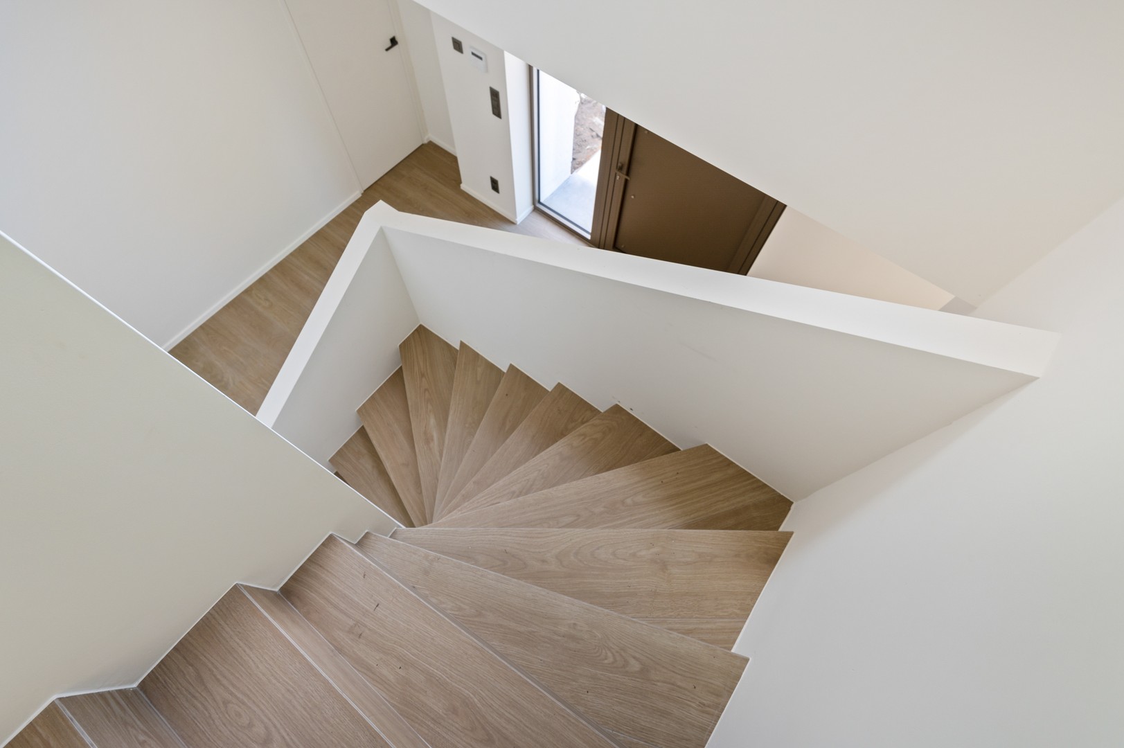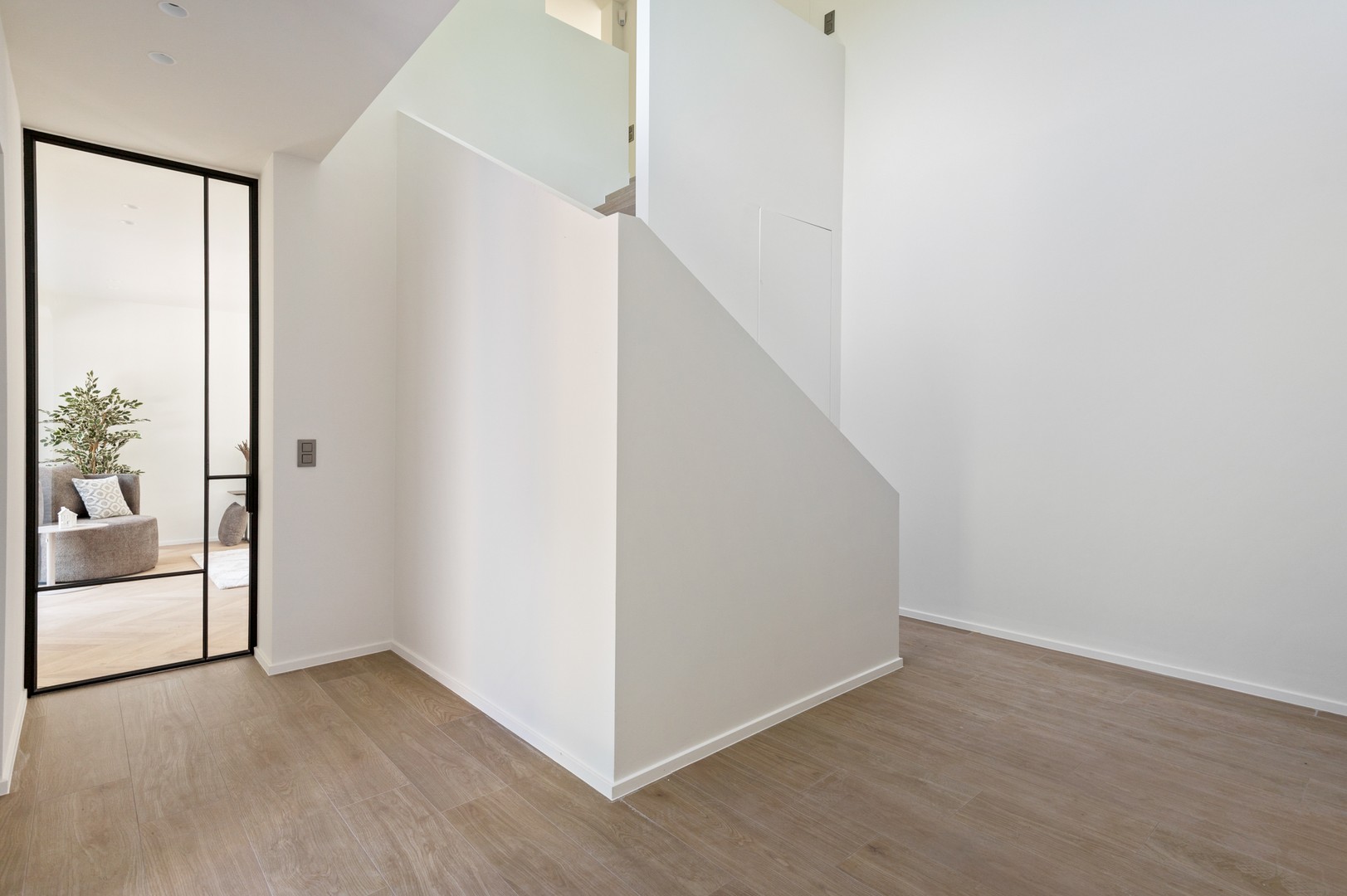 - Inkomhal: aan de buitenkant krijgt u al een voorsmaakje: in de groene omgeving imponeert deze villa met haar knappe moderne gevel. U komt binnen via een imposante inkomhal met overloop en plaats voor een knappe kroonluchter. Vanaf het moment dat u binnenstapt, ervaart u het licht en de ruimte van het interieur. De witte hal heeft een onopvallende blinde deur naar het gastentoilet met handenwasser.