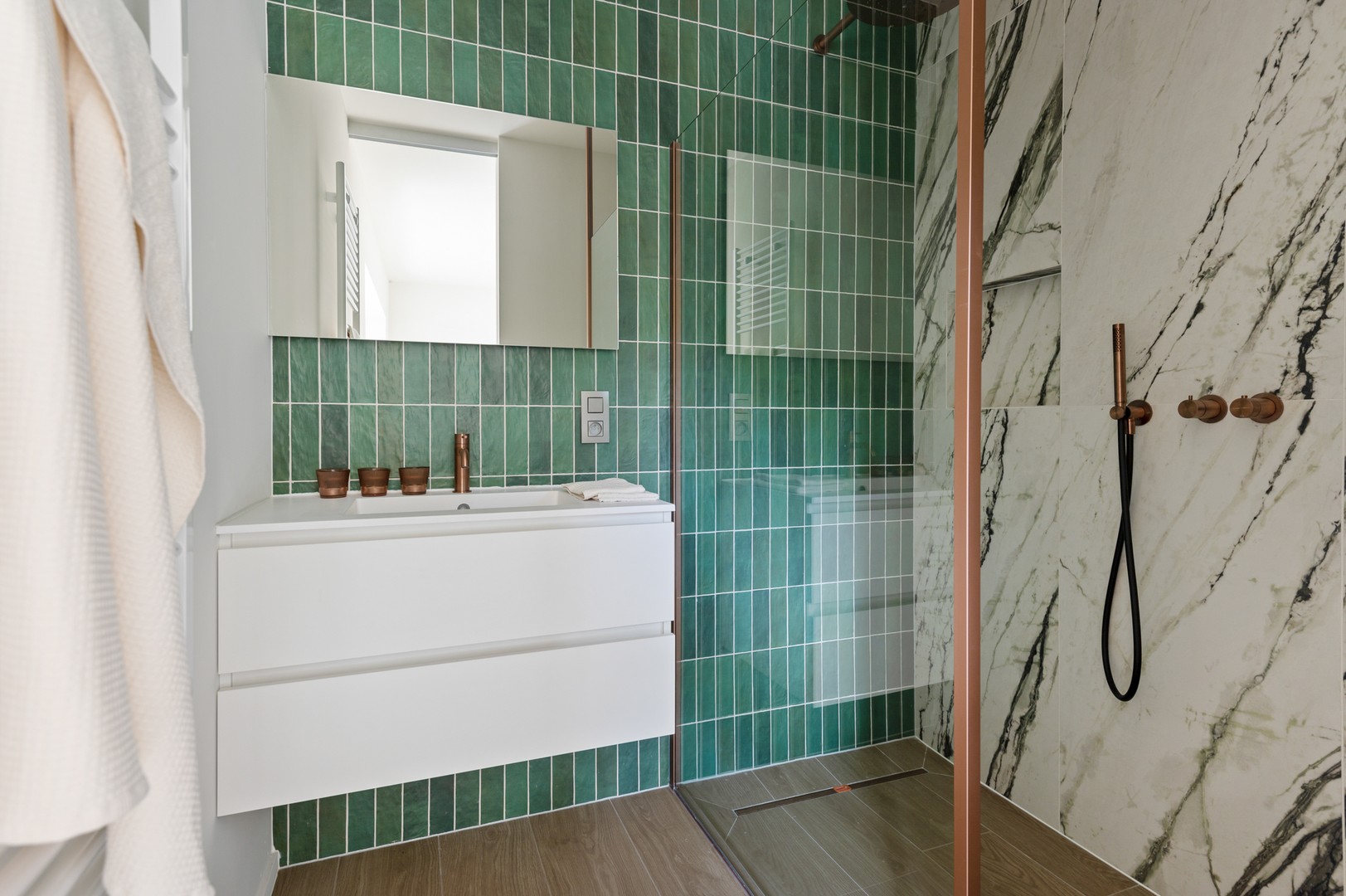 - 2 slaapkamers en 2 badkamers: nog op de benedenverdieping vindt u 2 slaapkamers met elks een eigen ensuite badkamer. De eerste en de grootste ligt aan de voorzijde van de woning en is ca. 15 m² groot. De badkamer wordt gekenmerkt door zijn lichtblauwe kleur en is voorzien van een groot ligbad, inloopdouche, handdoekdroger en wandmeubel met dubbele ingebouwde wastafel. Als het ’s avonds donker wordt en het dakraam niet meer voor voldoende natuurlijke lichtinval zorgt, knipt u de moderne inbouwspots aan. De slaapkamer achteraan van ca. 27,6 m² heeft grote ramen die zorgen voor veel licht en zicht op de tuin. Zet ‘s nachts gerust de ramen open. Want de buurt is zo rustig dat het luidste geluid van de zingende vogels en ruisende bomen komt. Ensuite vindt u een dressing met schuifdeur en badkamer met inloopdouche, wandmeubel met ingebouwde wastafel en handdoekdroger. Ook deze badkamer kreeg een eigen kleur – dit keer donkergroen.