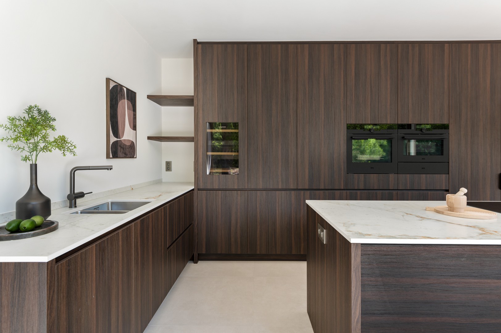 - Open volledig geïnstalleerde keuken: vanuit de leefruimte wandelt u verder naar de knappe keuken met zicht op de tuin. Tijdens het koken houdt u dus altijd een oogje in het zeil terwijl uw kinderen buiten ravotten. De donkere houtlook zorgt voor een bijzonder warme uitstraling in combinatie met het prachtige keramische blad, koperkleurige kranen en matzwarte moderne toestellen. Hobbykoks halen gegarandeerd hun hart wanneer ze deze volledig geïnstalleerde keuken (Augustijns) zien: inductiekookplaat met ingebouwde afzuigkap, heteluchtoven, combi-microgolfoven met warmhoudlade, ingebouwde vaatwasser, grote koelkast en vriezer – allemaal kwaliteitstoestellen van het merk AEG. Er is véél kastruimte om al uw keukenspullen overzichtelijk in op te bergen en ingebouwde wijnkoeler voor uw wijnverzameling. ’s Ochtends snel ontbijten doet u aan het keukeneiland.