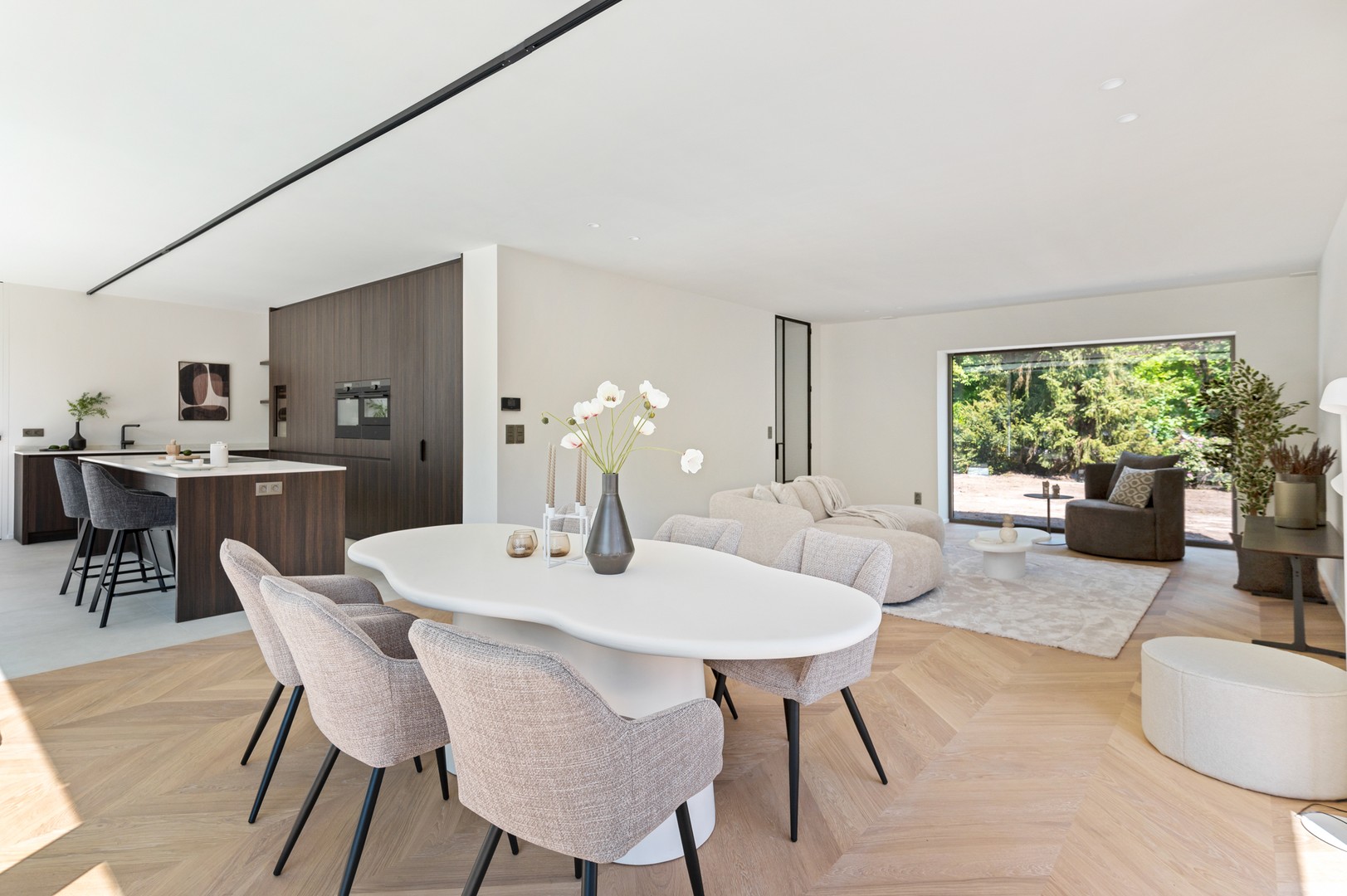 - Leefruimte met zicht op de tuin: via de smeedijzeren deur stapt u de open leefruimte binnen. Wedden dat u zich meteen thuis voelt? Het warme, mooie eiken visgraatparket zit daar zeker voor iets tussen. Dankzij de grote raampartijen komt er veel licht naar binnen en hebt u een mooi uitzicht op het groen rondom het huis. In het woongedeelte aan de voorzijde van het huis is er plaats voor een gezellig salon om tv te kijken. En het gedeelte aan de achtertuin is dan weer de ideale plek voor een grote eettafel om vrienden of familie te ontvangen. De achtergevel van de woning is van beneden tot boven en van links naar rechts opengetrokken met glaspartijen die zorgen dat het licht doorheen de villa gaat én die bovendien ook volledig open kunnen. Het vormt een mooie overgang naar de buitenruimte van het huis met het grote terras en de zonnige tuin.