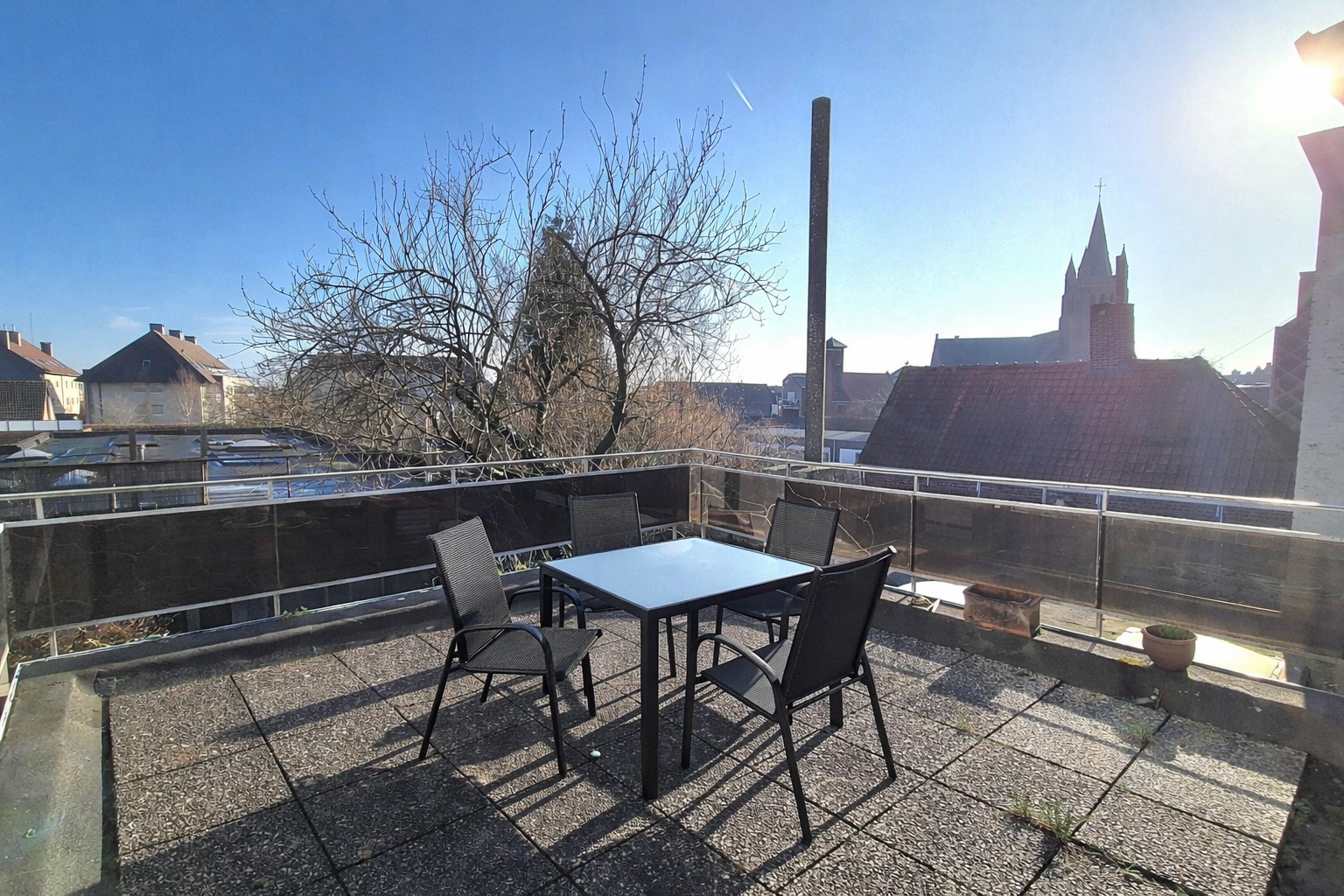 Op de eerste verdieping vind je 3 slaapkamers, een kitchenette, een 2e badkamer met toilet en lavabomeubel alsook een dakterras. Verder is er nog een ruime zolder, die extra mogelijkheden biedt.