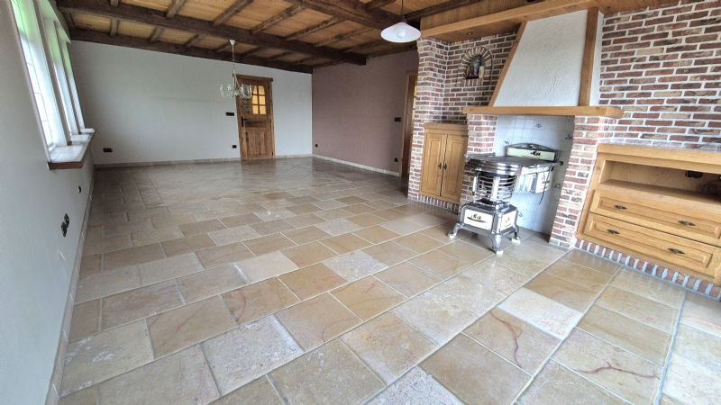•Gelijkvloers: inkomhal, gastentoilet, vestiaire, ruime gezellige living met vloerverwarming en Leuvense kachel, ingerichte keuken met eethoek, ruime wasplaats/berging, badkamer met douche, lavabomeubel en toilet, ruime slaapkamer met ingemaakte kasten.