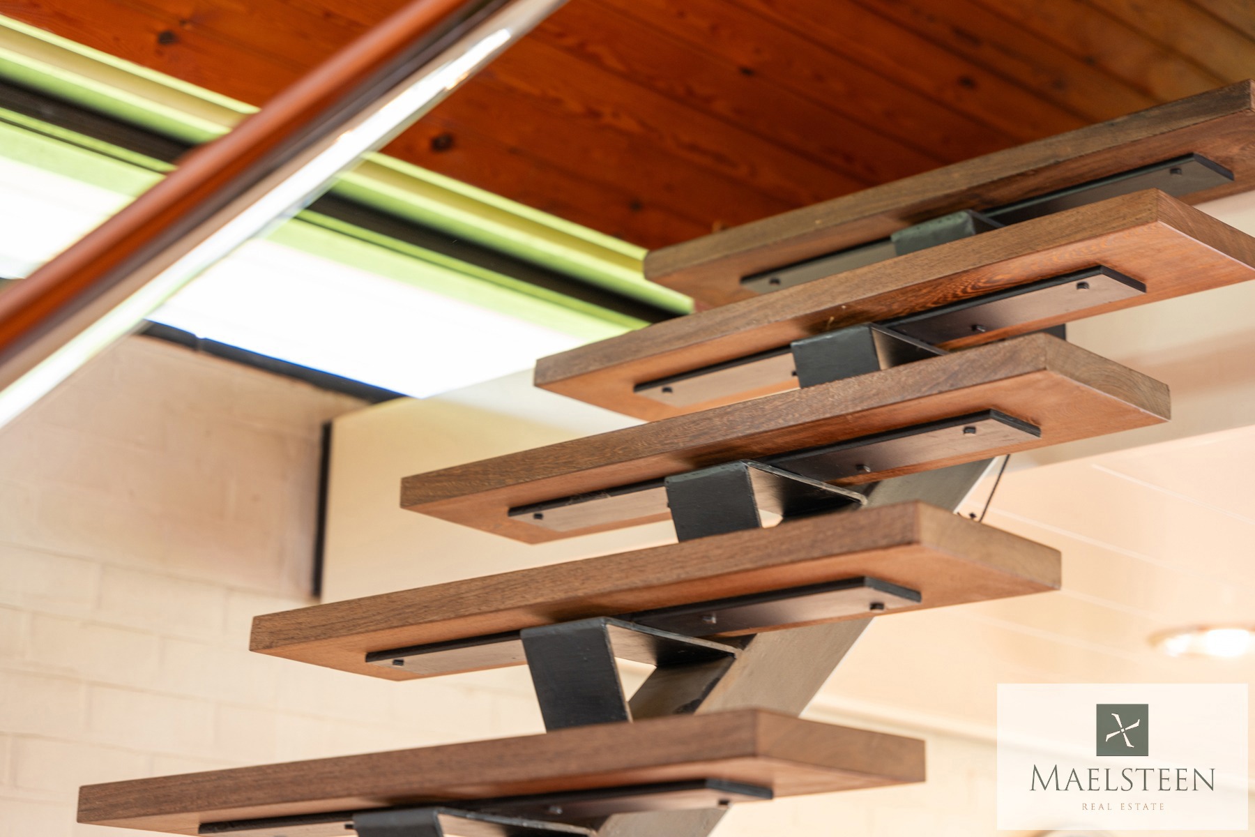 Inkomhal met zicht op de binnentuin en toegang naar het bureau met wachtruimte enerzijds en naar de sfeervolle woonkamer anderzijds. De ruime woonkamer bevat een eetplaats en het salon, boven dit salon is nog een polvalente ruimte (bibliotheek, bureau, studeerplek,…). Vanuit de woonkamer heeft u zicht op de tuin met vijver (zwemmen of koi) en toegang tot het zonnige terras. Aparte keuken met ontbijtbar en toegang naar de kelder. De burelen zijn toegankelijk vanuit het salon via een 2de hal (met apart toilet en lavabo), vanwaar u toegang heeft naar de tuin.