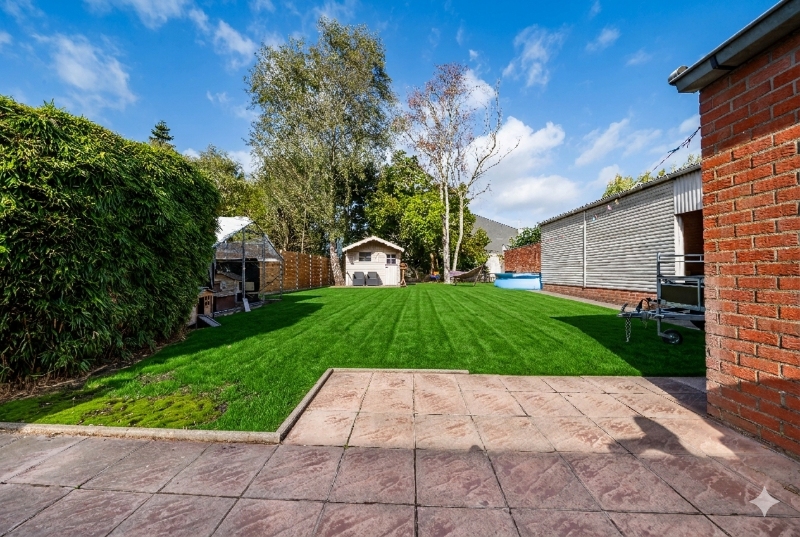 Binnenin beschikt de woning over vier ruime slaapkamers (waarvan één op het gelijkvloers), twee badkamers, een grote garage en een praktische berging. Via de garage heb je rechtstreekse toegang tot de tuin, waar zich onder de overkapping nog extra bergruimte bevindt.