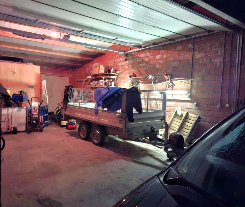 •Grote garage ca.45m² met elektrische sectionale poort, poorthoogte van ca.3m en UITWEG achteraan!!