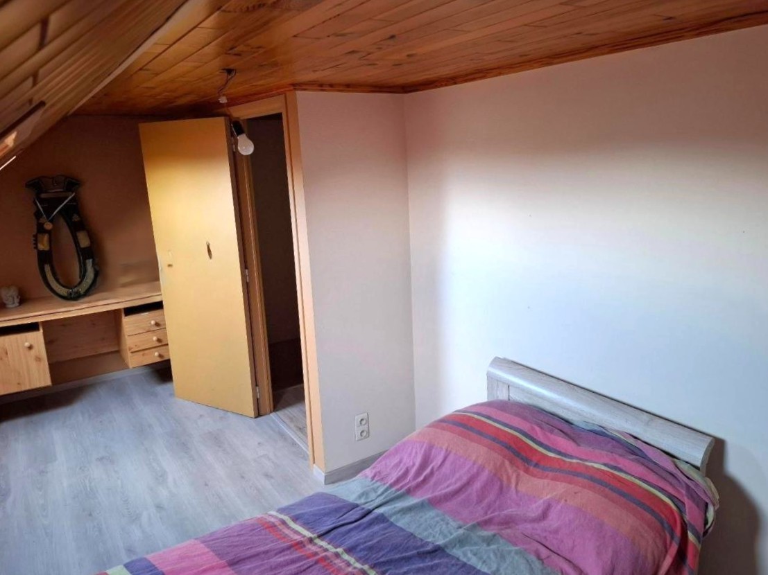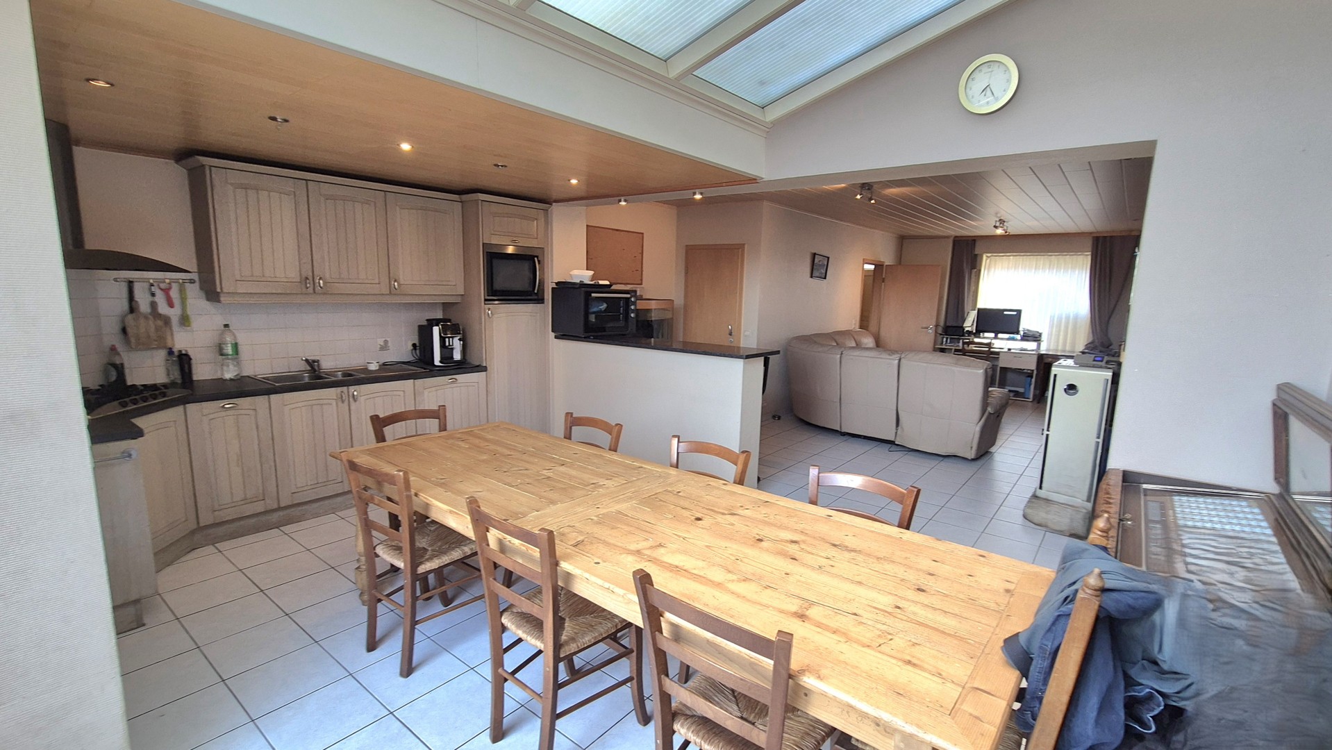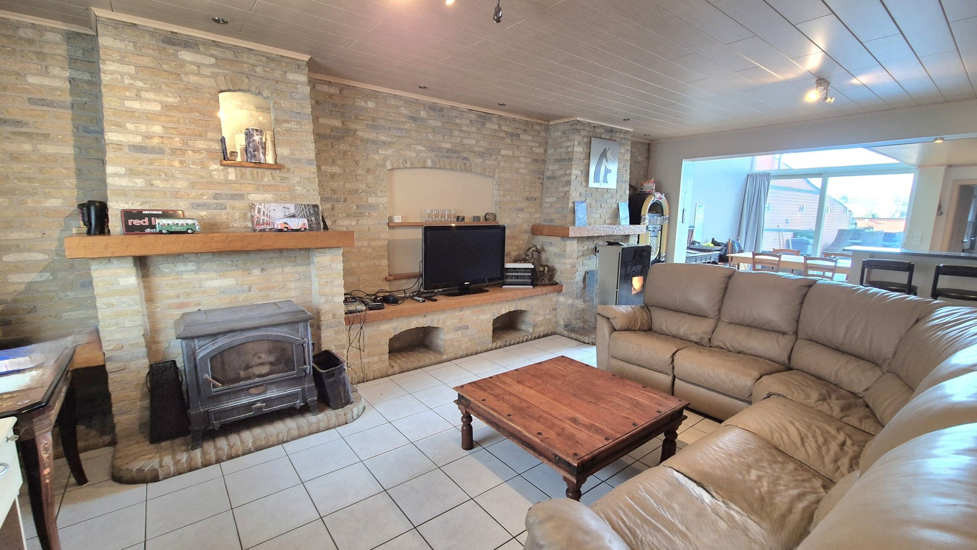 •Gezellige leefruimte met zithoek en houtkachel + recente pelletkachel (overname pelletkachel bespreekbaar met eigenaar)