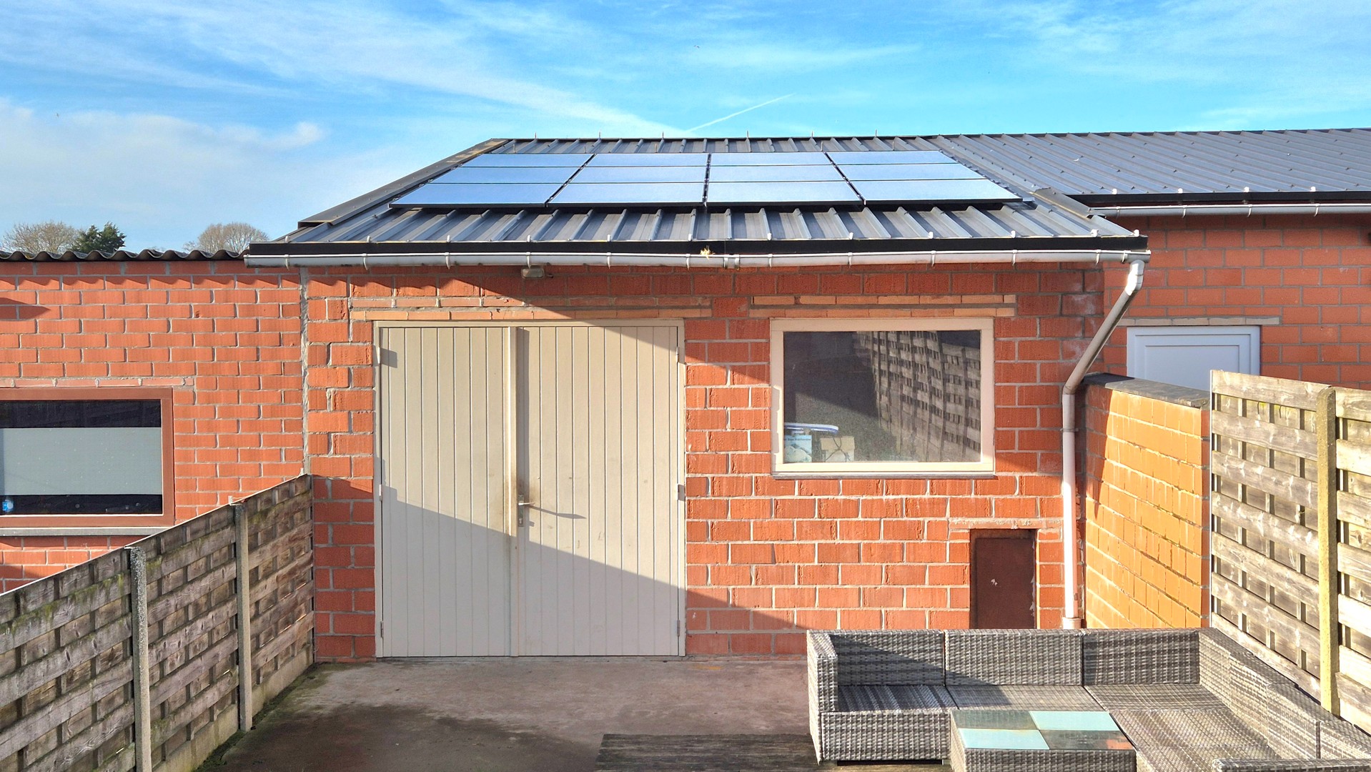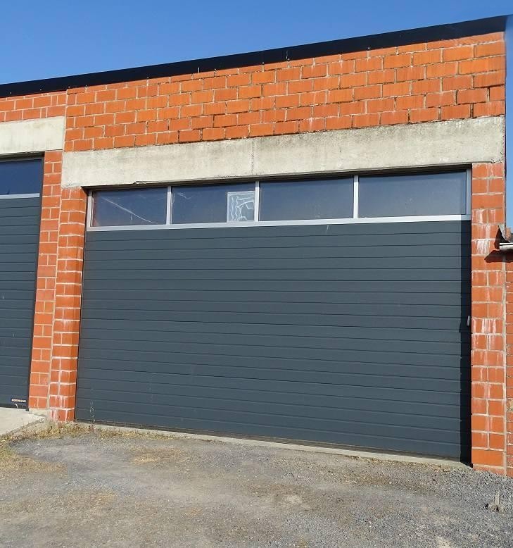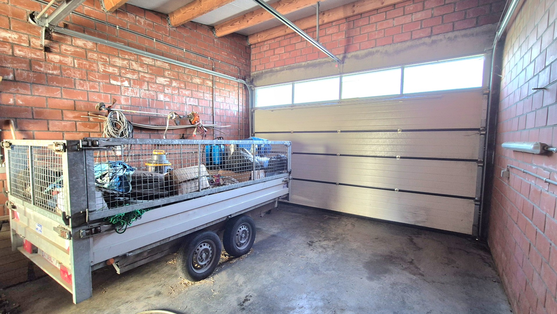 •Grote garage ca.45m² met elektrische sectionale poort, poorthoogte van ca.3m en UITWEG achteraan!!