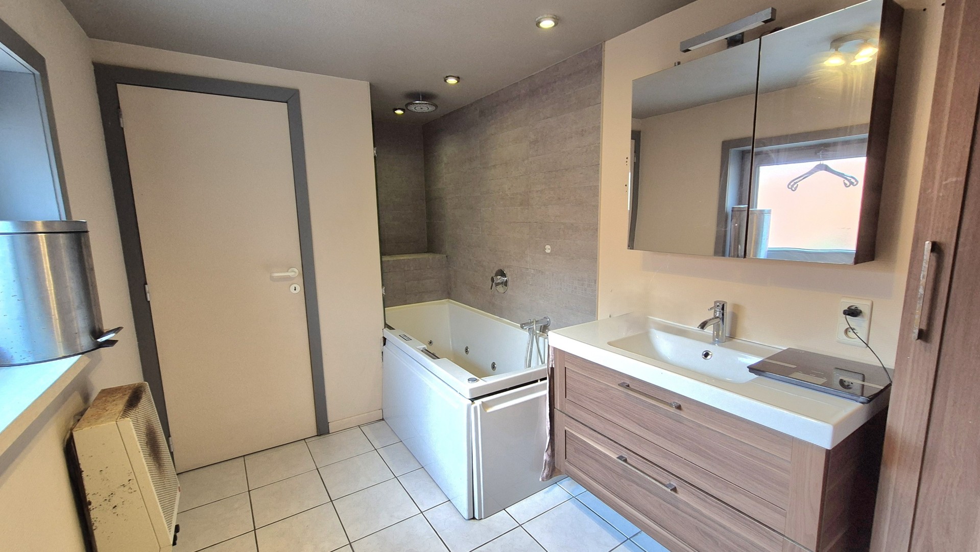 •Badkamer (gelijkvloers) uitgerust met ligbad (met jacuzzi-functie), lavabomeubel en apart toilet (hangWC)