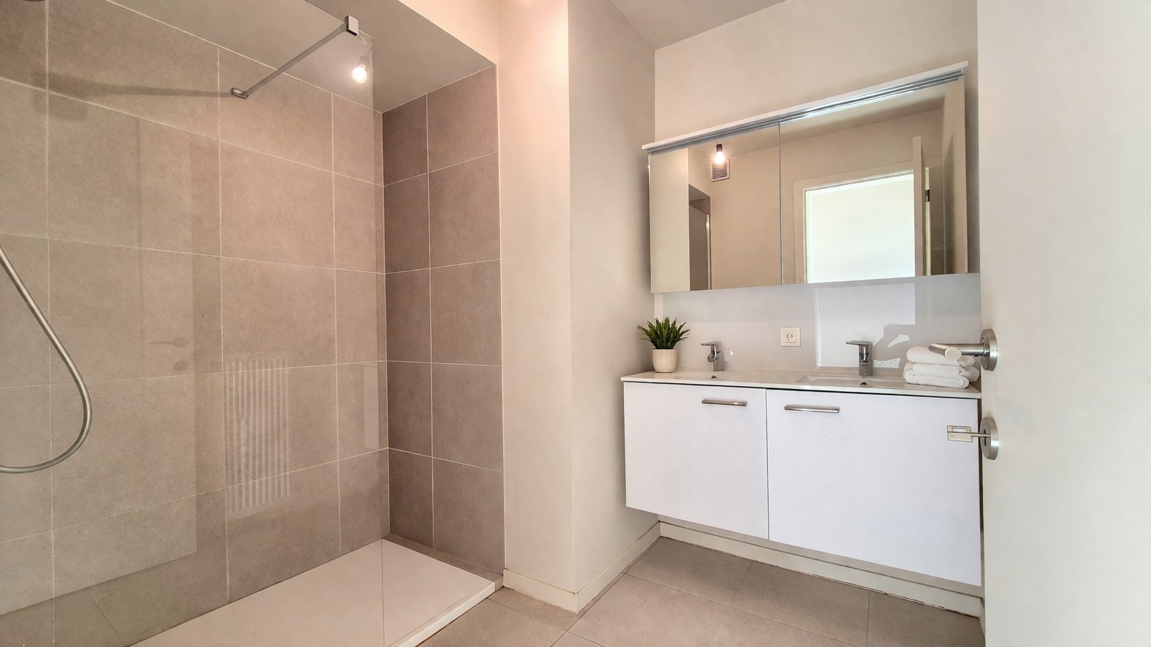 •Ingerichte badkamer met inloopdouche en dubbel lavabomeubel